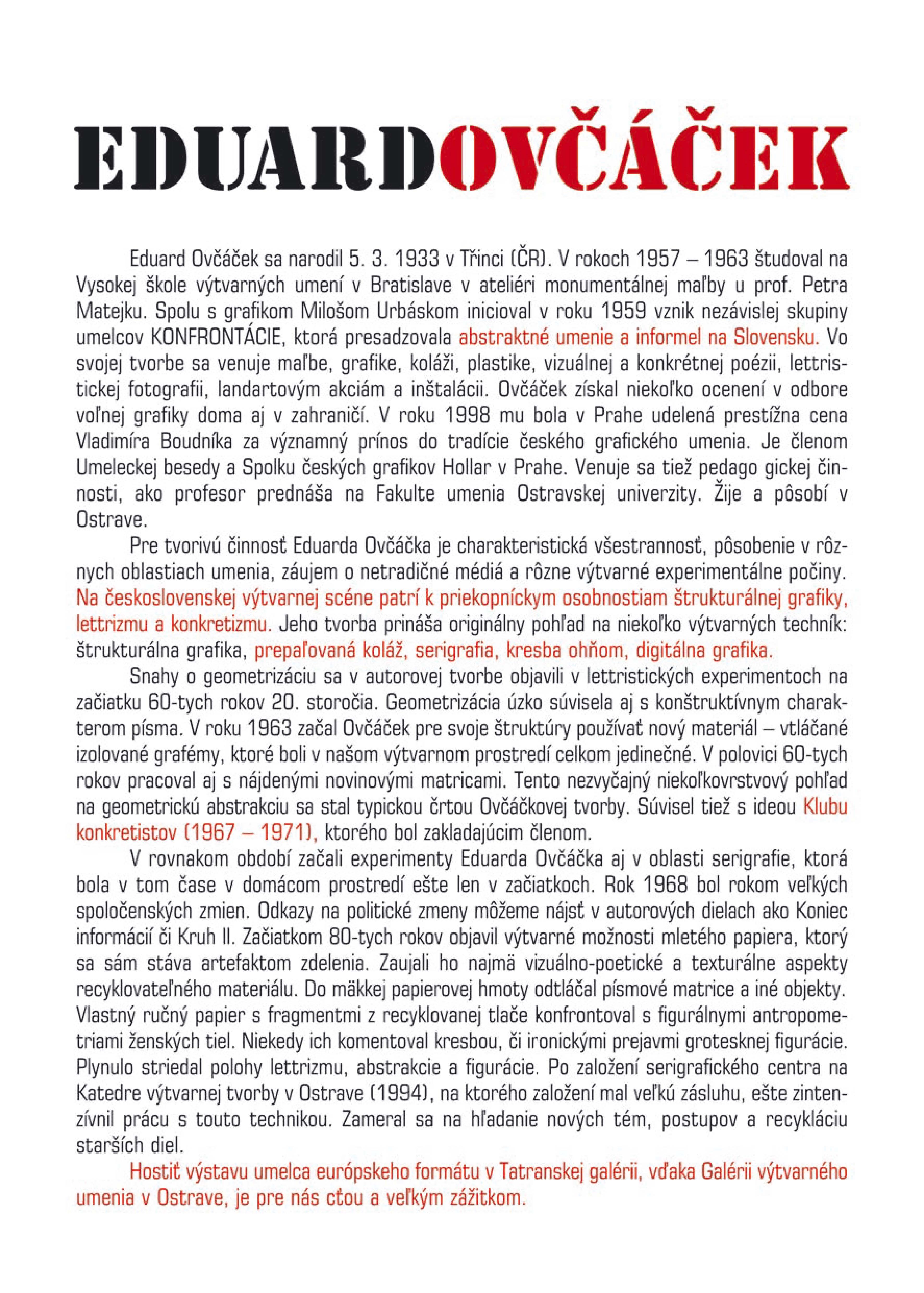Ostravsko nemá príliš veľa umelcov, ktorí by sa tak výrazným spôsobom zapísali do povojnových dejín umenia, ako je to v prípade Eduarda Ovčáčka. Jeho dôležitosť v československom, ale aj medzinárodnom meradle spočíva v konkrétnych výsledkoch tvorby, ale aj v spôsobe aktívneho života s čistým svedomím, kde nám je povzbudivým príkladom.