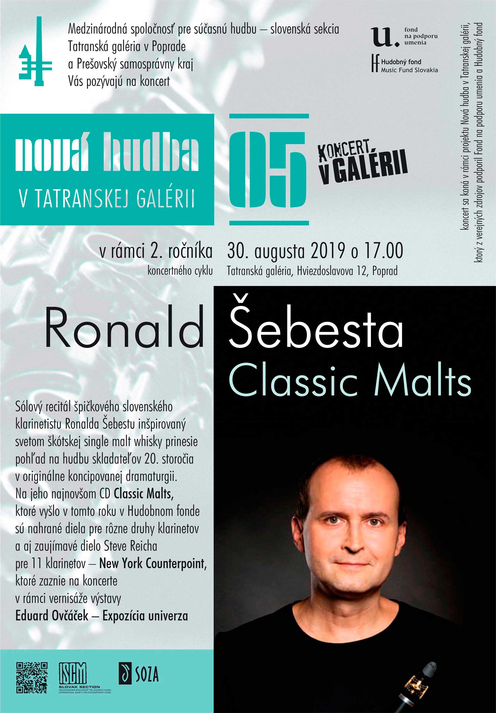 Vernisáž výstavy s osobnou účasťou umelca sa uskutoční 30. 8. 2019 o 17:00. Súčasťou vernisáže bude koncert Ronalda Šebestu – Classic malts.