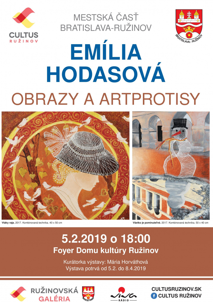 Ružinovská výtvarníčka Emília Hodasová sa venuje maľbe, artprotisu i textilnej koláží, no autorská paličkovaná čipka zostáva v jej tvorbe stále prítomná. Autorka totiž do svojich textílií i obrazov vkladá i vliepa fragmenty i súvislejšie kompozície z čipky, čím vnáša do svojich diel poetiku a krehkosť.