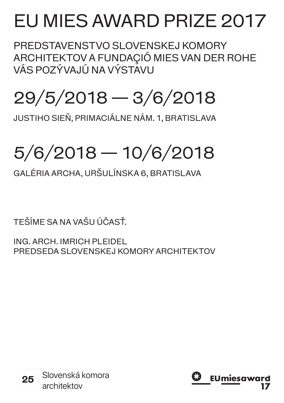 V utorok, dňa 29. mája 2018, bude v Primaciálnom paláci otvorená výstava Mies van der Rohe Award 2017, za účasti šéfkurátora Ivana Blasi, z Fundació Mies van der Rohe z Barcelony. V úvode večera sa svojím príhovorom dotkne tejto významnej udalosti i predseda Slovenskej komory architektov Ing. arch. Imrich Pleidel.