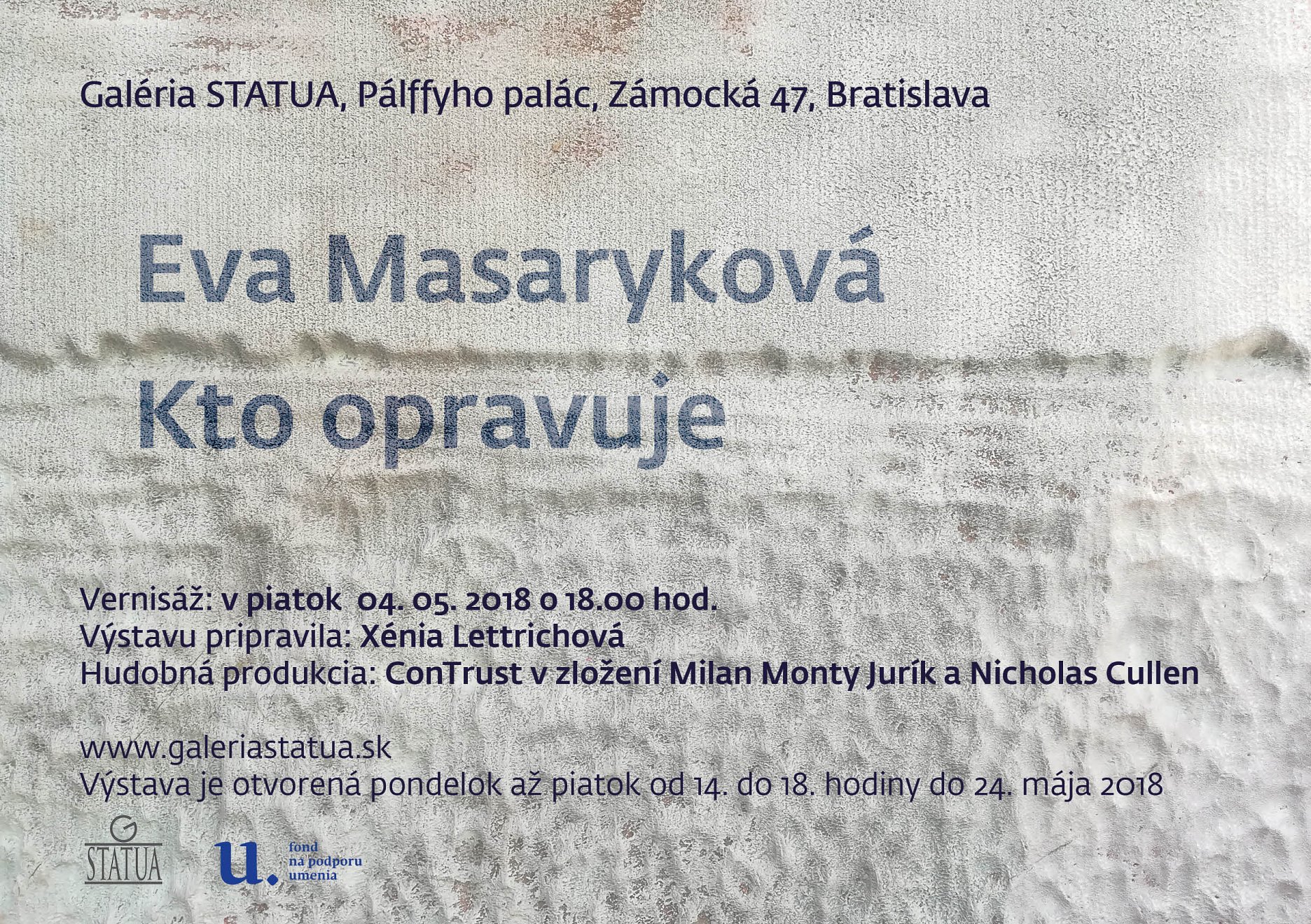 Vo výstavnom projekte Evy Masarykovej Kto opravuje sa zbieha viacero obsahových línií, inšpirovaných konkrétnymi ľuďmi, pričom všetky spoločne prekrýva časový faktor ako stále prítomný majestát v našom bytí i v nezvratnom procese zanikania stôp po ňom. A s tým súvisí i naša prirodzená snaha o zastavenie a uchovanie si subjektívne dôležitého momentu alebo súvislosti. Evine témy sú zväčša autobiografické, reflektujú osobnú situáciu a skúsenosti v kontexte rodiny, vďaka čomu sú autentické a presvedčivé... X.L.