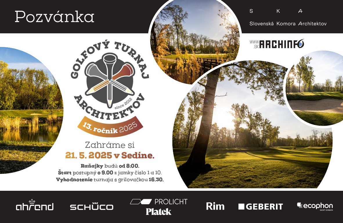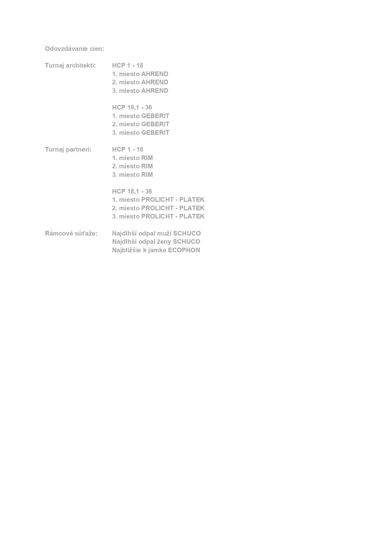 Ceny: Trofeje za prvé tri miesta v hodnotení architektov a partnerov vo všetkých kategóriách, najdlhší odpal, najbližšie k jamke. Vecné ceny od sponzorov.