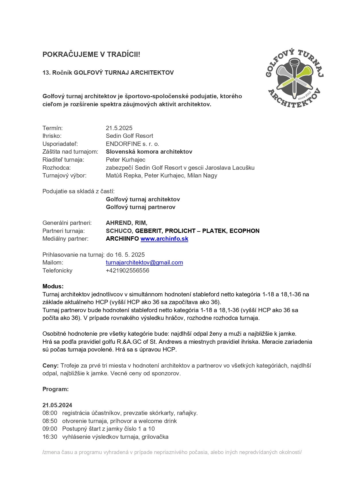 | Kontakt | Matúš Repka 0905 212 515 turnajarchitektov@gmail.com |