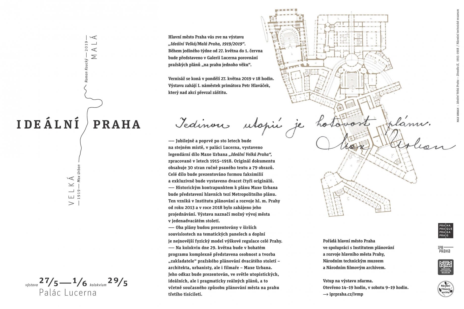 Výstava „Ideální Velká/Malá Praha, 1919/2019“ predstaví behom jediného týždňa od 27. mája do 1. júna 2019 v Galérií Lucerna porovnanie pražských plánov „na prahu jedného veku“. Výstavu a doprovodné kolokvium usporiada hlavné mesto Praha v spolupráci s Inštitútom plánovania a rozvoja, Národným technickým múzeom a Národným filmovým archívom.