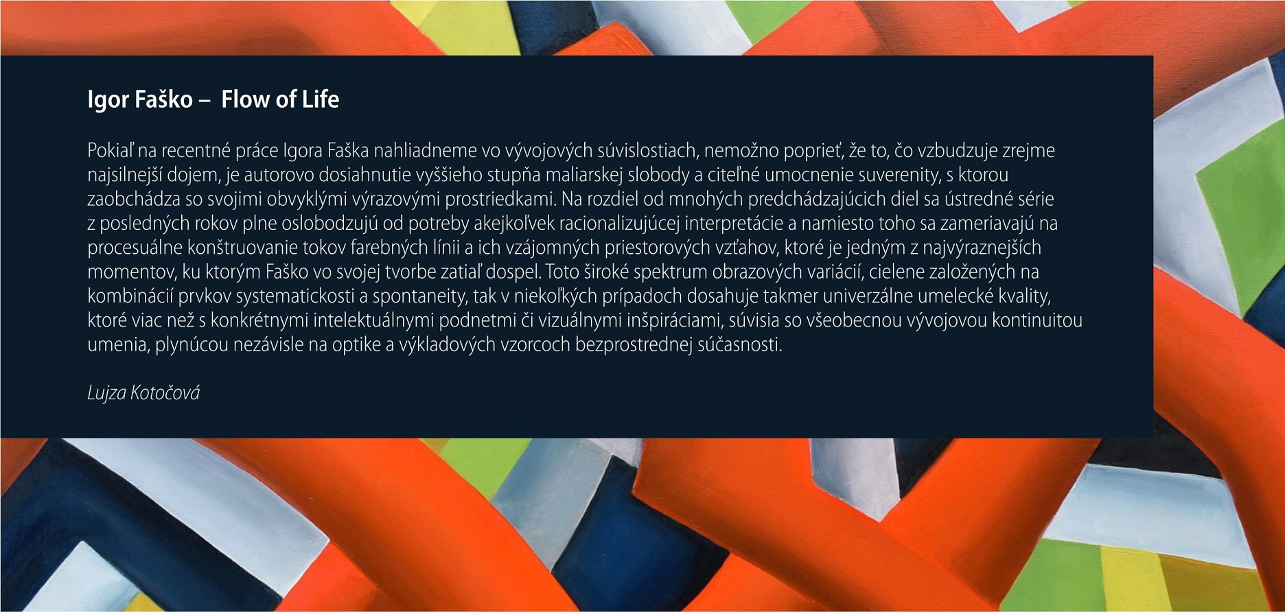 Pokiaľ na recentné práce Igora Faška nahliadneme vo vývojových súvislostiach, nemožno poprieť, že to, čo vzbudzuje zrejme najsilnejší dojem, je autorovo dosiahnutie vyššieho stupňa maliarskej slobody a citeľné umocnenie suverenity, s ktorou zaobchádza so svojimi obvyklými výrazovými prostriedkami. Na rozdiel od mnohých predchádzajúcich diel sa ústredné série z posledných rokov plne oslobodzujú od potreby akejkoľvek racionalizujúcej interpretácie a namiesto toho sa zameriavajú na procesuálne konštruovanie tokov farebných línii a ich vzájomných priestorových vzťahov, ktoré je jedným z najvýraznejších momentov, ku ktorým Faško vo svojej tvorbe zatiaľ dospel. Toto široké spektrum obrazových variácií, cielene založených na kombinácií prvkov systematickosti a spontaneity, tak v niekoľkých prípadoch dosahuje takmer univerzálne umelecké kvality, ktoré viac než s konkrétnymi intelektuálnymi podnetmi či vizuálnymi inšpiráciami, súvisia so všeobecnou vývojovou kontinuitou umenia, plynúcou nezávisle na optike a výkladových vzorcoch bezprostrednej súčasnosti.