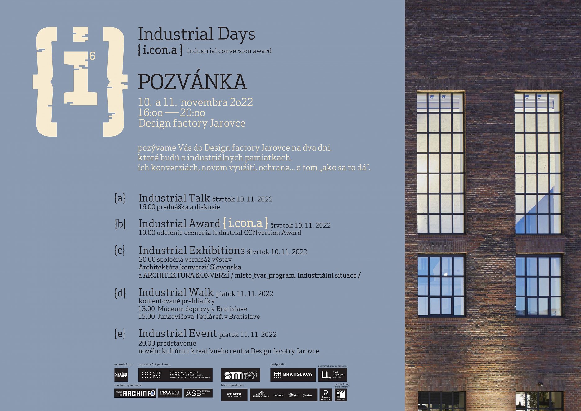 Vernisáž výstav sa uskutoční v rámci šiesteho vydania festivalu Industrial Days v novembri 2022 v priestoroch nového kultúrno-kreatívneho centra Dve Sýpky v Jarovciach. Výstava zároveň predstaví 20 najinšpiratívnejších projektov, ktoré vyberie medzinárodná porota ako úspešných nominantov na udelenie ceny I.CON.A