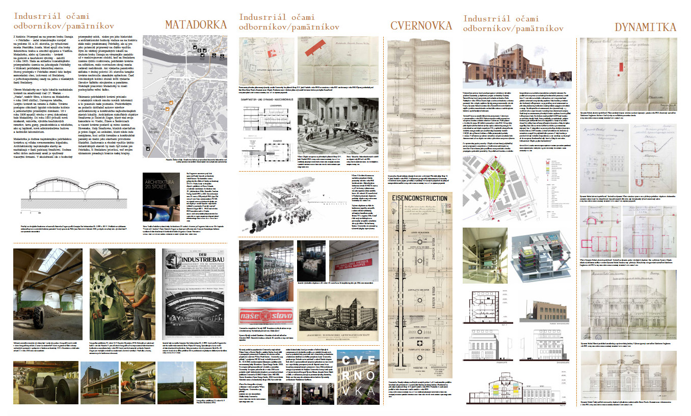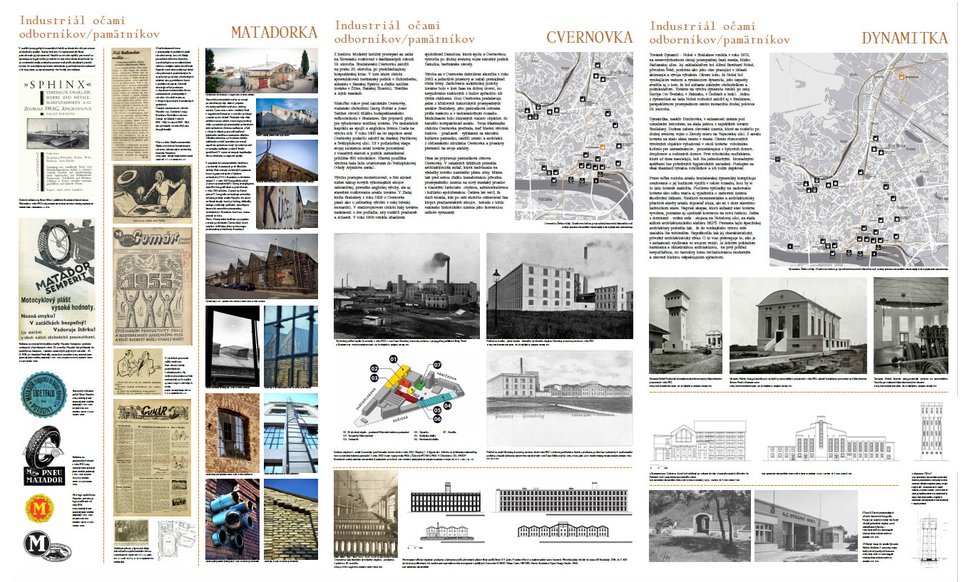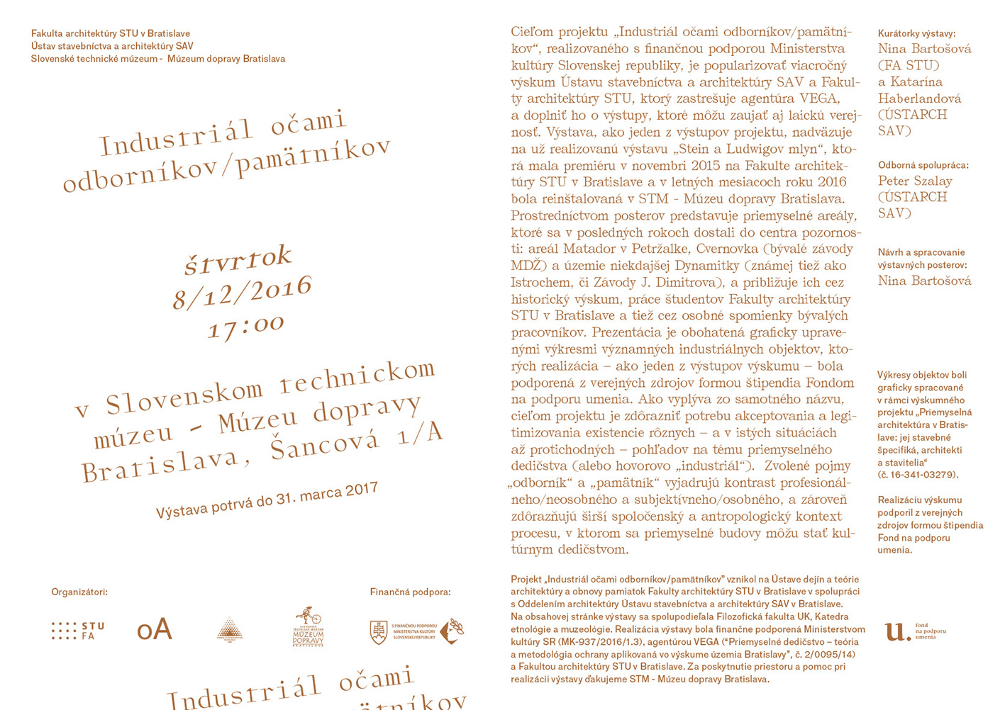 Cieľom projektu „Industriál očami odborníkov/pamätníkov“, realizovaného s finančnou podporou Ministerstva kultúry Slovenskej republiky, je popularizovať viacročný výskum Ústavu stavebníctva a architektúry SAV a Fakulty architektúry STU, ktorý zastrešuje agentúra VEGA a doplniť ho o výstupy, ktoré môžu zaujať aj laickú verejnosť. Výstava, ako jeden z výstupov projektu, nadväzuje na už realizovanú výstavu „Stein a Ludwigov mlyn“, ktorá mala premiéru v novembri 2015 na Fakulte architektúry STU v Bratislave a v letných mesiacoch roku 2016 bola reinštalovaná v STM - Múzeu dopravy Bratislava. Prostredníctvom posterov predstavuje priemyselné areály, ktoré sa v posledných rokoch dostali do centra pozornosti: areál Matador v Petržalke, Cvernovka (bývalé závody MDŽ) a územie niekdajšej Dynamitky (známej tiež ako Istrochem, či Závody J. Dimitrova), a približuje ich cez historický výskum, práce študentov Fakulty architektúry STU v Bratislave a tiež cez osobné spomienky bývalých pracovníkov. Prezentácia je obohatená graficky upravenými výkresmi významných industriálnych objektov, ktorých realizácia – ako jeden z výstupov výskumu – bola podporená z verejných zdrojov formou štipendia Fondom na podporu umenia. Ako vyplýva zo samotného názvu, cieľom projektu je zdôrazniť potrebu akceptovania a legitimizovania existencie rôznych – a v istých situáciách až protichodných – pohľadov na tému priemyselného dedičstva (alebo hovorovo „industriál“). Zvolené pojmy „odborník“ a „pamätník“ vyjadrujú kontrast profesionálneho/neosobného a subjektívneho/osobného, a zároveň zdôrazňujú širší spoločenský a antropologický kontext procesu, v ktorom sa priemyselné budovy môžu stať kultúrnym dedičstvom.