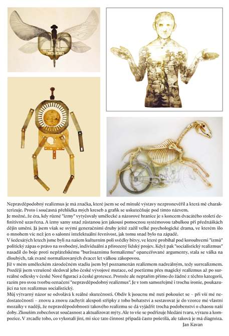 Nepravděpodobný realizmus je má značka, které jsem se od minulé výstavy nezpronevěřil a která mě charakterizuje. Proto i současná přehlídka mých kreseb a grafik se uskutečňuje pod tímto názvem.