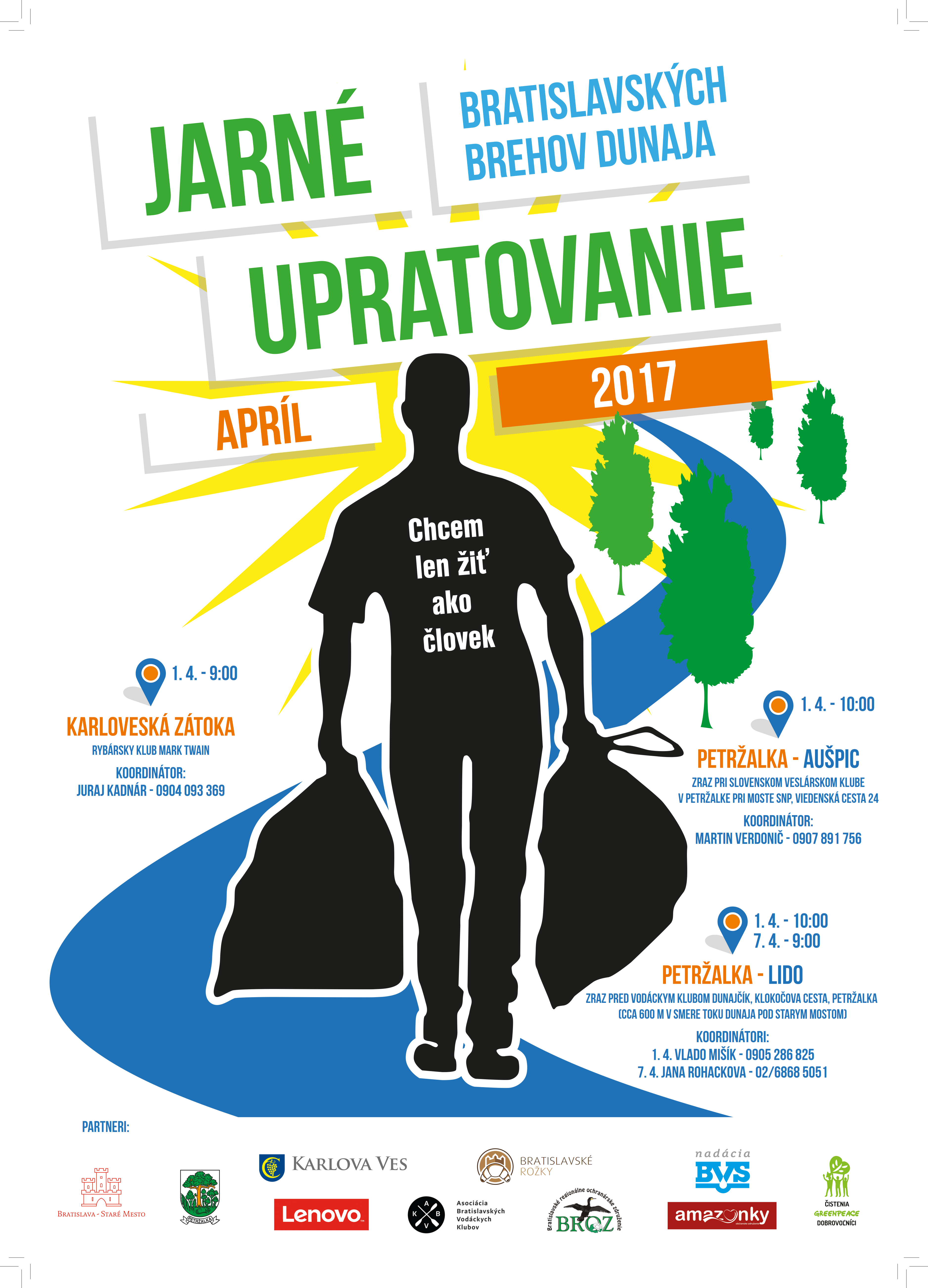 Všetci dobrovoľníci budú mať k dipozícii vrecia na odpad a zberné kontajnery. Miesta všetkých zrazov a kontakty na koordinátorov podujatia nájdete na plagáte. Aktuálne informácie sledujte na FB stránke Asociácie bratislavských vodáckych klubov, ktorá je hlavným organizátorom jarného upratovania.