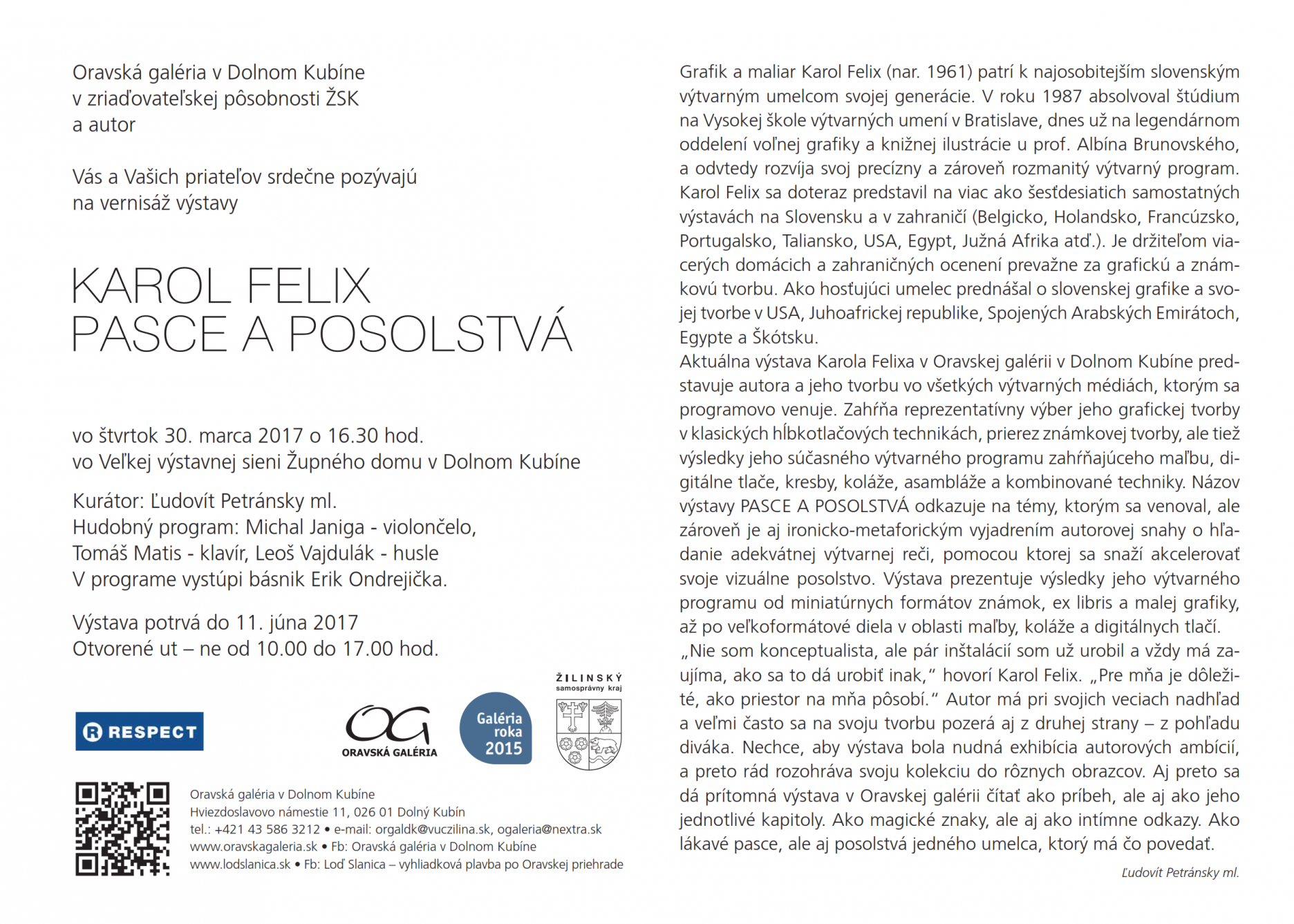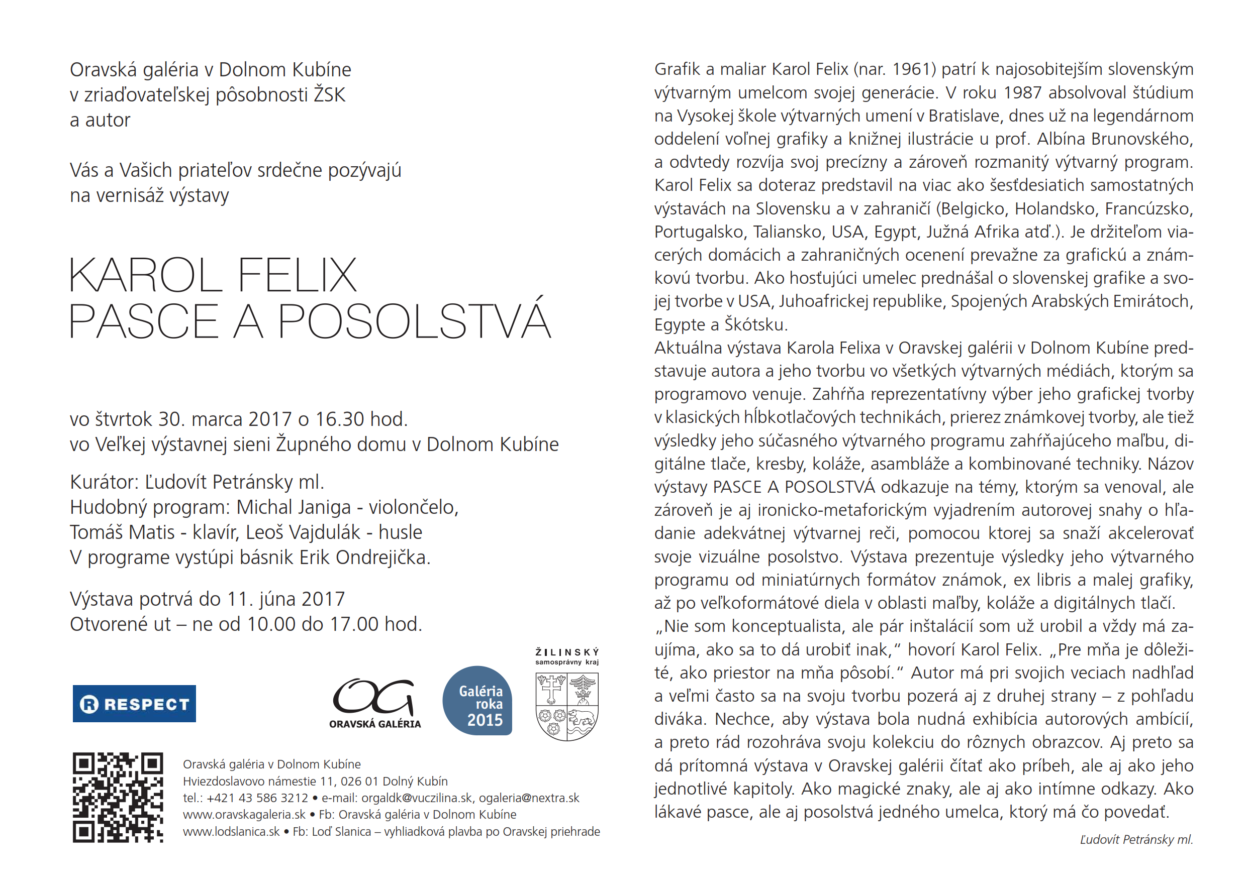 Grafik a maliar Karol Felix (nar. 1961) patrí k najosobitejším slovenským výtvarným umelcom svojej generácie. V roku 1987 absolvoval štúdium na Vysokej škole výtvarných umení v Bratislave, dnes už na legendárnom oddelení voľnej grafiky a knižnej ilustrácie u prof. Albína Brunovského, a odvtedy rozvíja svoj precízny a zároveň rozmanitý výtvarný program. Karol Felix sa doteraz predstavil na viac ako šesťdesiatich samostatných výstavách na Slovensku a v zahraničí (Belgicko, Holandsko, Francúzsko, Portugalsko, Ta liansko, USA, Egypt, Južná Afrika atď.). Je držiteľom viacerých domácich a zahraničných ocenení prevažne za grafickú a známkovú tvorbu. Ako hosťujúci umelec prednášal o slovenskej grafike a svojej tvorbe v USA, Juhoafrickej republike, Spojených Arabských Emirátoch, Egypte a Škótsku. Aktuálna výstava Karola Felixa v Oravskej galérii v Dolnom Kubíne predstavuje autora a jeho tvorbu vo všetkých výtvarných médiách, ktorým sa programovo venuje. Zahŕňa reprezentatívny výber jeho grafickej tvorby v klasických hĺbkotlačových technikách, prierez známkovej tvorby, ale tiež výsledky jeho súčasného výtvarného programu zahŕňajúceho maľbu, digitálne tlače, kresby, koláže, asambláže a kombinované techniky. Názov výstavy PASCE A POSOLSTVÁ odkazuje na témy, ktorým sa venoval, ale zároveň je aj ironicko-metaforickým vyjadrením autorovej snahy o hľadanie adekvátnej výtvarnej reči, pomocou ktorej sa snaží akcelerovať svoje vizuálne posolstvo. Výstava prezentuje výsledky jeho výtvarného programu od miniatúrnych formátov známok, ex libris a malej grafiky, až po veľkoformátové diela v oblasti maľby, koláže a digitálnych tlačí. „Nie som konceptualista, ale pár inštalácií som už urobil a vždy má zaujíma, ako sa to dá urobiť inak,“ hovorí Karol Felix. „Pre mňa je dôležité, ako priestor na mňa pôsobí.“ Autor má pri svojich veciach nadhľad a veľmi často sa na svoju tvorbu pozerá aj z druhej strany – z pohľadu diváka. Nechce, aby výstava bola nudná exhibícia autorových ambícií, a preto rád rozohráva svoju kolekciu do rôznych obrazcov. Aj preto sa dá prítomná výstava v Oravskej galérii čítať ako príbeh, ale aj ako jeho jednotlivé kapitoly. Ako magické znaky, ale aj ako intímne odkazy. Ako lákavé pasce, ale aj posolstvá jedného umelca, ktorý má čo povedať.