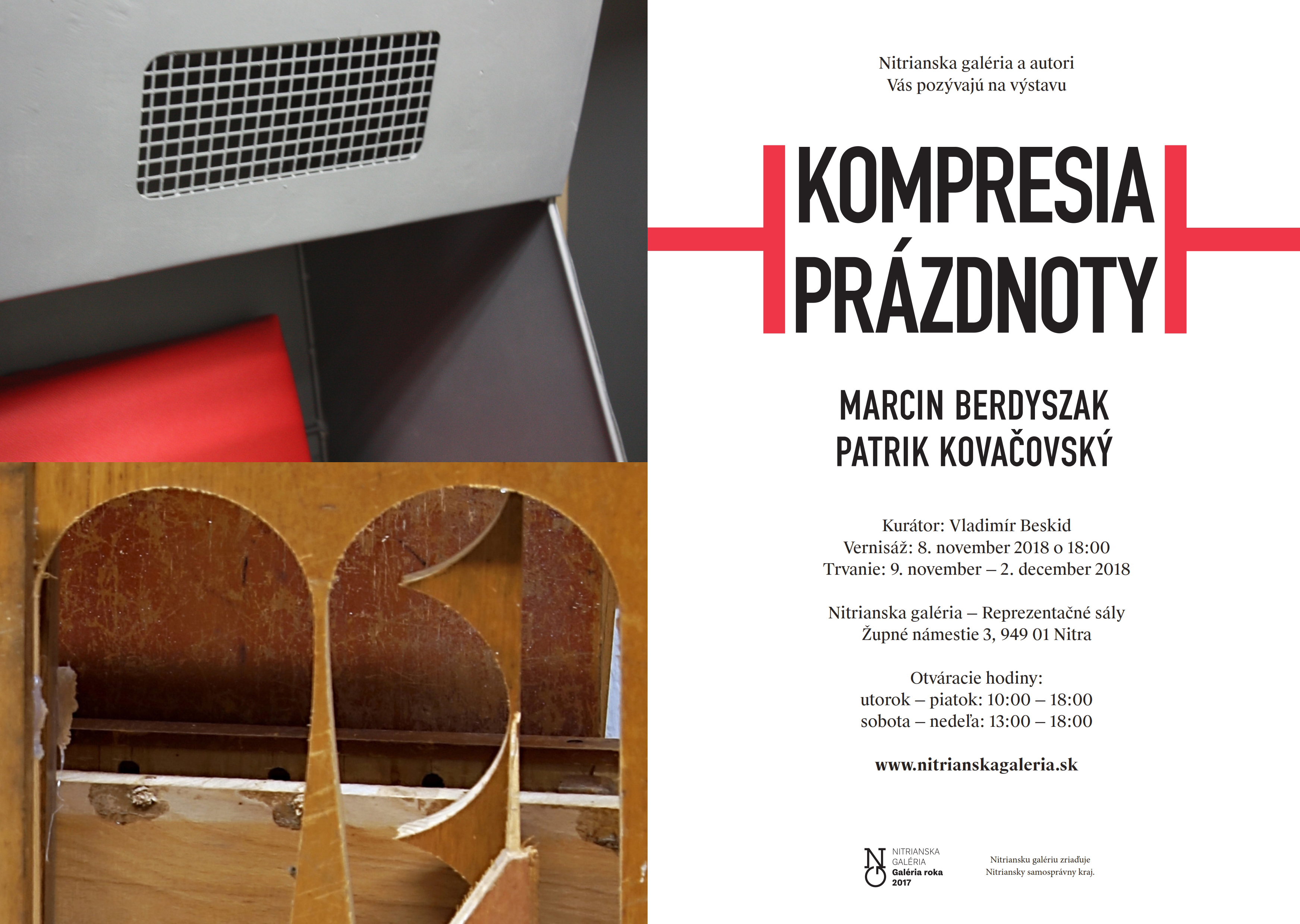 Výstavný projekt pod názvom Kompresia prázdnoty prináša naliehavý poľsko-slovenský rozhovor sochárskych foriem a tvarov dvoch intermediálnych umelcov: Marcina Berdyszaka (*1964) a Patrika Kovačovského (*1970). Ide o spoločné 3D modelovanie situácie, kde hlavnú rolu zohrávajú silné sochárske hmoty – bariéry, citlivé „stlačenie“, či obaľovania prázdna a recyklácia nájdených, alebo druhotných materiálov.