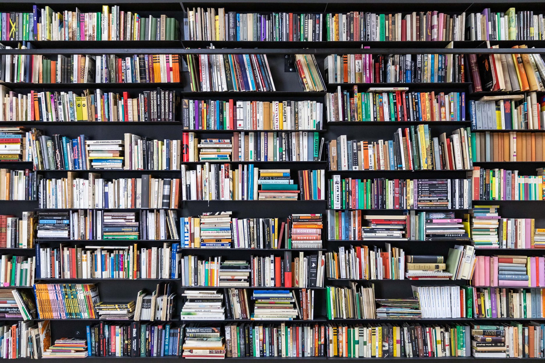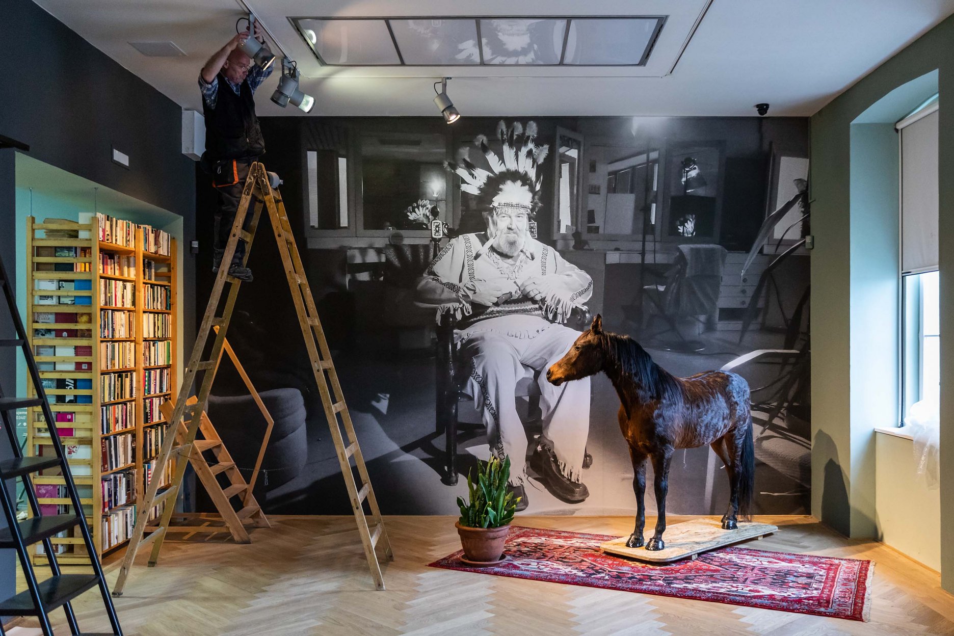 Földváriovskú knižnicu sme nepoňali iba funkčne, ale pridali sme ďalšiu vrstvu – jej vizuálnu podobu. Chceli sme ukázať knižnicu ako súčasť životného priestoru, ako fyzické miesto a urobiť zmysluplnú inštaláciu z toho, ako Kornel pod láskavým dohľadom pani Nade premenil vlastný byt na obraz svojej knihomoľskej vášne. To, čo mali Földváriovci rozhodené v priestore bytu, sme nainštalovali na stenu, chaos sme usporiadali do obrazu. Výsledkom je zavesená knižnica – obraz Kornelovho zberateľstva.