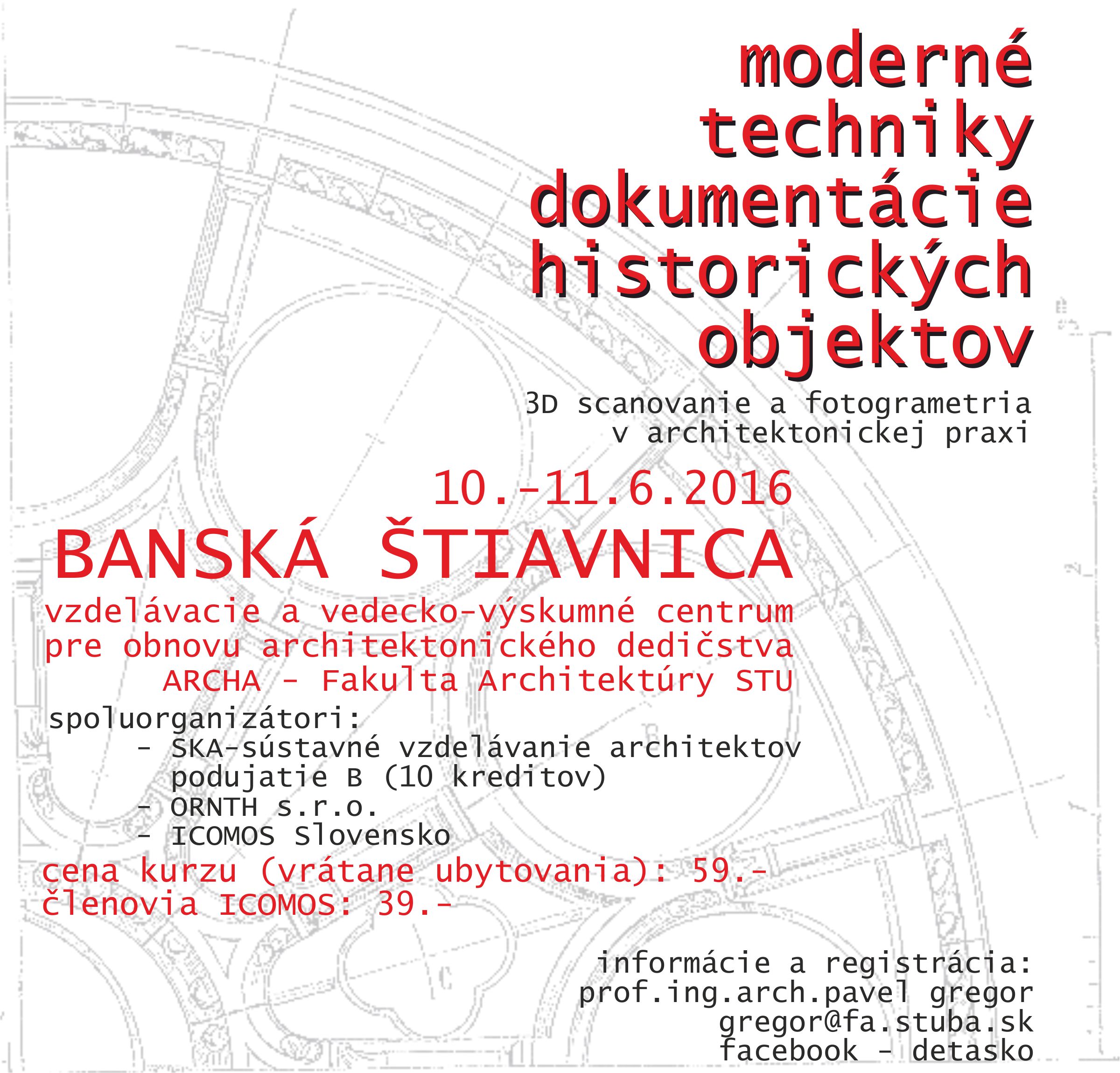 Kurz sa uskutoční v termíne 10.- 11. júna 2016 v Detašovanom pracovisku FA STU Banská Štiavnica, Radničné nám. č. 2. Cena kurzu je 59.- € (vrátane ubytovania), pre študentov a členov ICOMOS Slovensko je cena 39.- €.