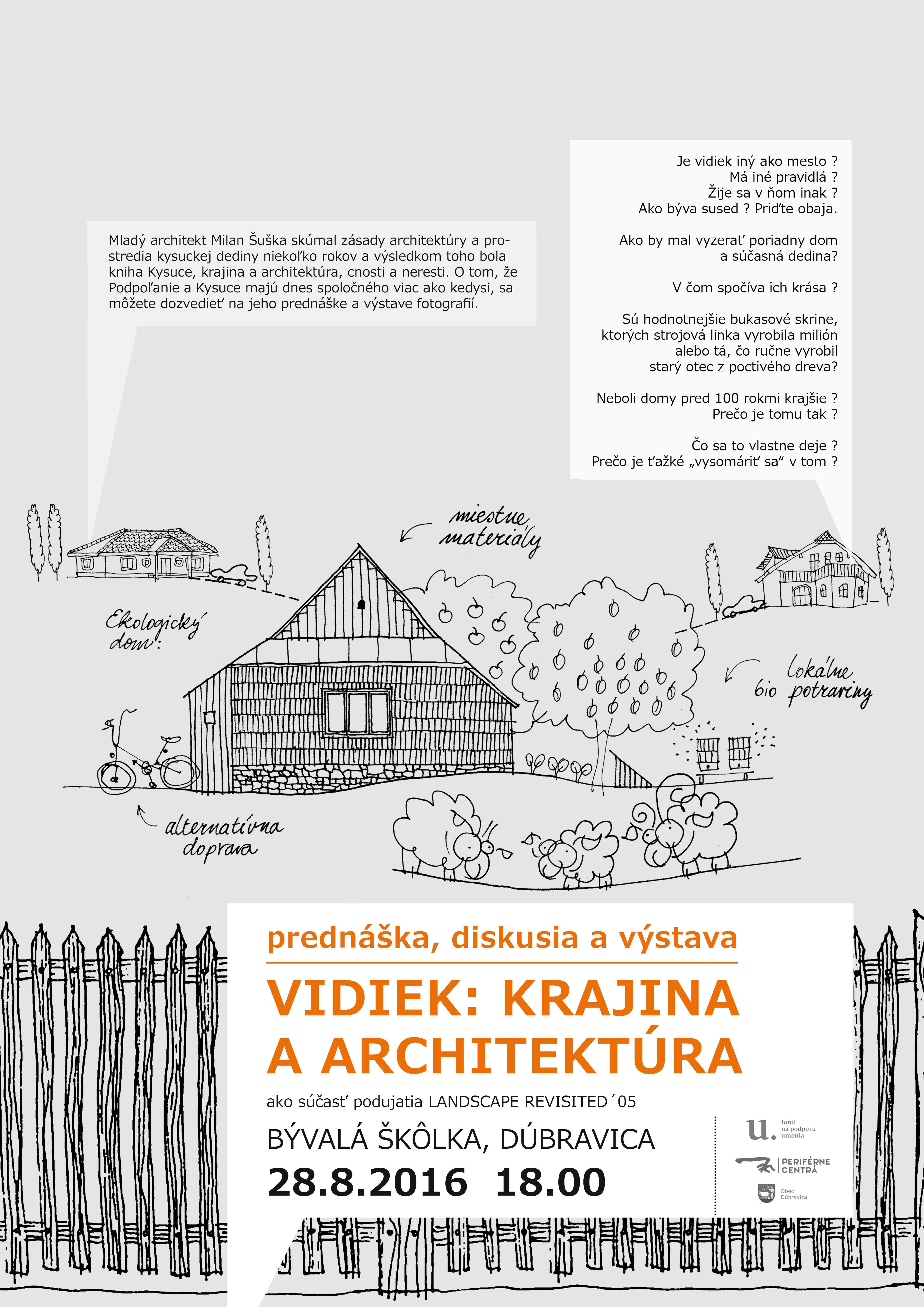 Prednáška a diskusia so sprievodnou výstavou autorských fotografií v objekte bývalej materskej školy v Dúbravici. Architekt Milan Šuška sa mapovaniu súčasného stavu architektúry Kysúc a celkovo vidieka venoval v dizertačnej práci a doktorskom štúdiu na Fakulte architektúry VUT v Brne. Svoj výskum publikoval v knihe Kysuce, krajina a architektúra, cnosti a neresti.