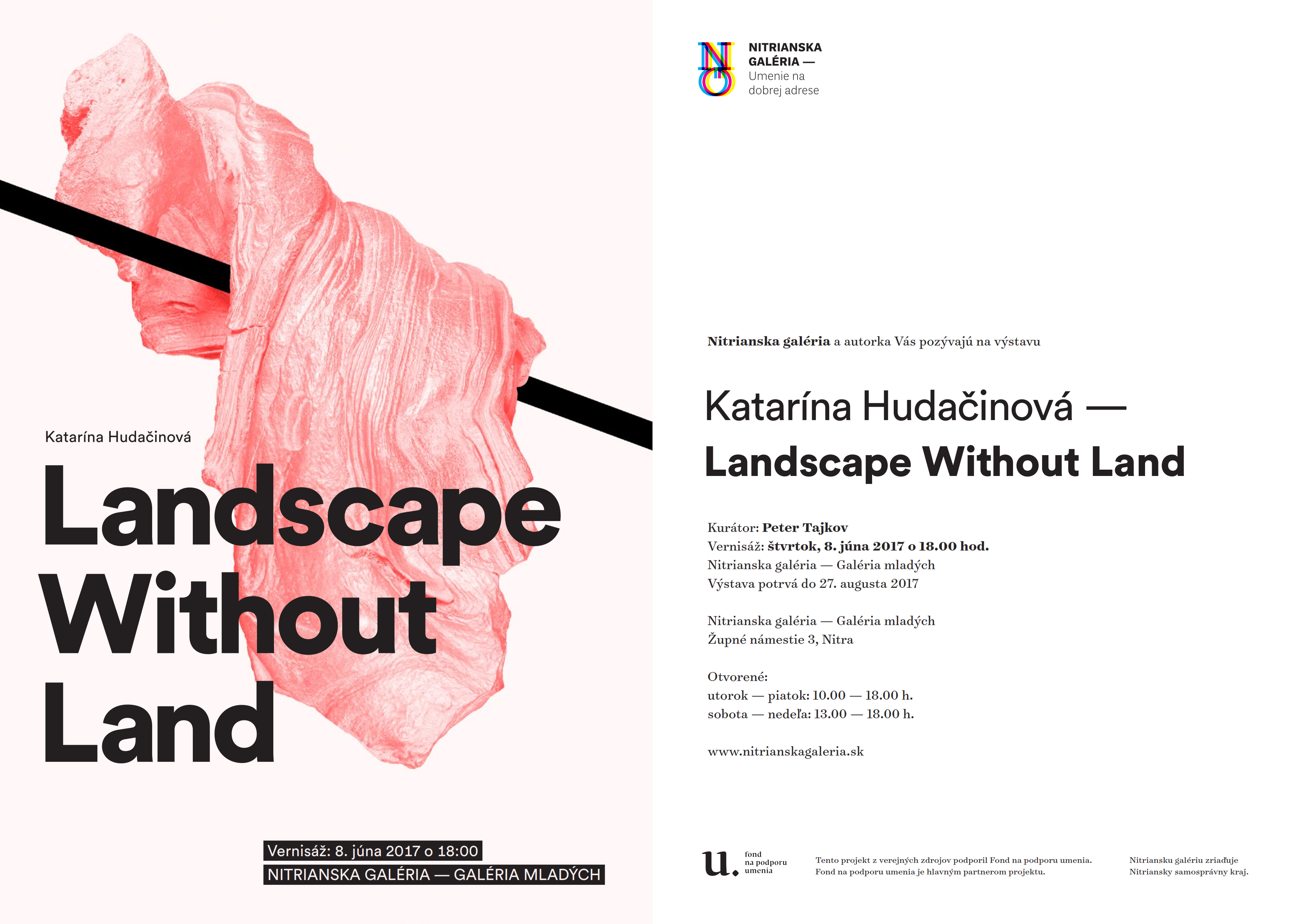 Výstava Landscape Without Land je najnovším výtvarným projektom slovenskej fotografky Kataríny Hudačinovej žijúcej v Prahe. V Nitrianskej galérii premiérovo predstavuje diela, ktoré sú prevažne výsledkom jej nedávnej umeleckej rezidencie na Islande. Autorka primárne pracuje s fotografickým médiom, ale fotografia je pre ňu v tomto projekte predovšetkým nástrojom pre získanie umeleckého materiálu, ktorý ďalej rozvíja. Táto práca spočíva predovšetkým v transformácii fotografického obrazu napríklad smerom k priestorovému objektu, resp. priamo k objektovej fotografii. Niekedy iba narúša prirodzený kontext zobrazovaného motívu manipulovanou farebnosťou, orezávaním alebo umelým osvetlením a syntetizuje tak často prekvapivý obraz/objekt, ktorý na jednej strane vychádza z organických prírodných tvarov, ale autorkinou transformáciou získava novú autonómnu entitu. Ideovým východiskom Hudačinovej aktuálnej tvorby je intenzívny záujem o prírodu, v tomto prípade najmä prostredie islandského pobrežia poznačeného silnou vulkanickou činnosťou či atmosférickými javmi. Jej zámerom je sprostredkovať zážitok z tejto nevšednej krajiny, prefiltrovať ju cez svoju autorskú optiku a spomínané výtvarné postupy a následne ju preniesť do galerijného priestoru poväčšine formou site-specific inštalácie. Autorka sa tak prispôsobuje atypickej výstavnej ploche, ktorej dominuje schodiskový priestor a tak jej transformovaná islandská krajina doslova prerastá celým objektom galérie. Divák môže sledovať ako sa napríklad začiatok schodiska premieňa jej videoinštaláciou na dno vulkanického krátera, alebo ako sa svetelné úkazy na oblohe, mohutnosť lávových území, či mikrosvet minerálov transformujú do autonómnych výtvarných objektov vnútornej imaginatívnej krajiny autorky. Katarína tak divákovi ponúka z môjho pohľadu atraktívnu podobu súčasnej fotografie, ktorá čoraz viac prestupuje svoje tradičné mediálne hranice, povedzme aj smerom k fotografickému objektu.