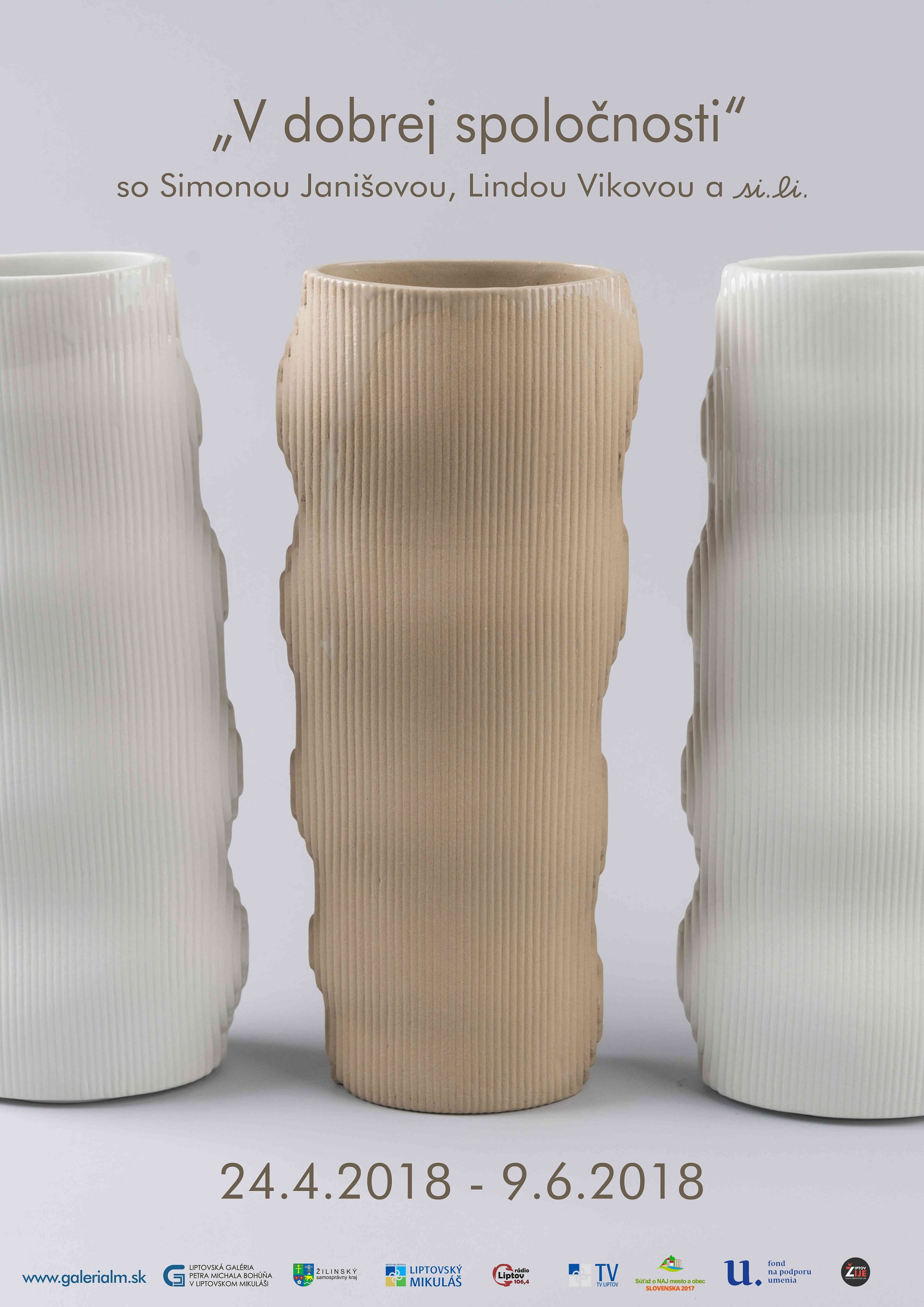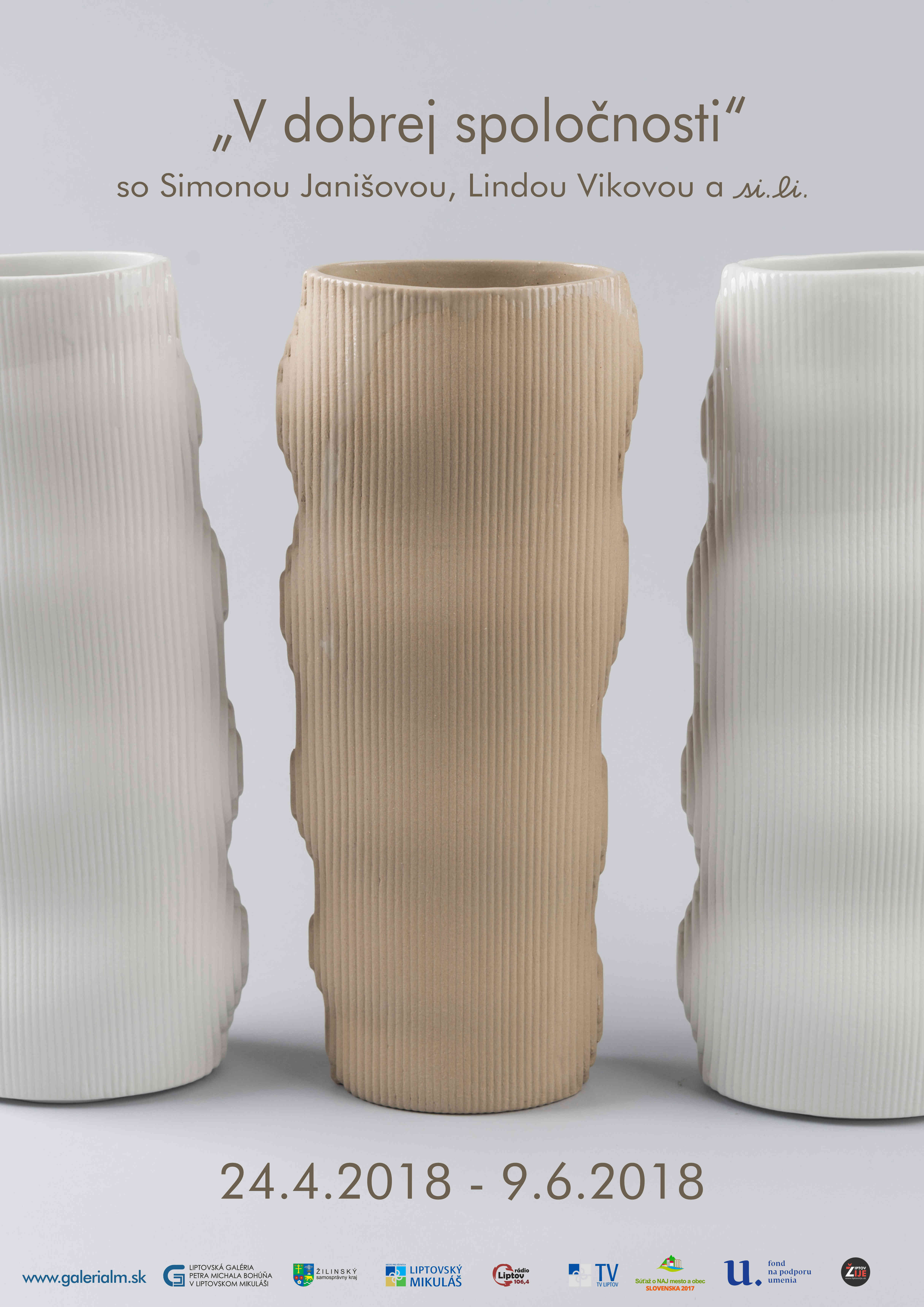 „V dobrej spoločnosti“ sa ocitáme na výstave dizajnovo zušľachtenej úžitkovej keramiky. Jej autorkami sú Linda Viková a Simona Janišová, ktorých tvorivá energia sa prezentuje aj pod značkou si.li (od r. 2012) - navrhujú a produkujú porcelán a kameninu, ktoré sú primárne úžitkové a remeselne bravúrne prevedené. Ich prístupy k materiálu sú diametrálne odlišné a predsa v súčinnosti vytvárajú harmonické celky. Tieto keramikárky tvoria v spoločnom ateliéri limitované edície diel, ktoré sú prácami individuálnymi alebo spoločnými. Tak je koncipovaná tiež ich prezentácia v Malej výstavnej sieni LGPMB - pomyselne je rozdelená na tri časti, ktoré však hovoria jednotným jazykom o si.li - o spoločnej práci či individuálnych projektoch oboch autoriek.