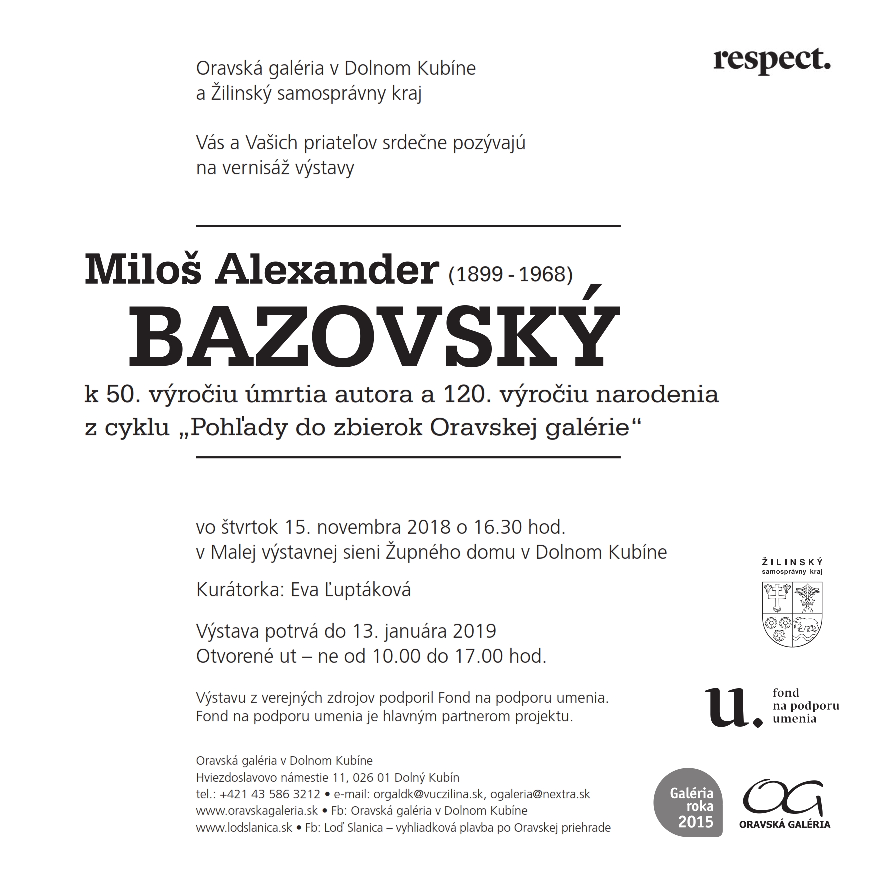Výstava, pripravená pri príležitosti 120. výročia narodenia a 50. výročia úmrtiaMiloša Alexandra Bazovského (11. januára 1899 Turany nad Váhom – 15. decembra 1968 Trenčín )sa zamerala na zmapovanie jeho umeleckej tvorby, ktorá má v zbierkach Oravskej galérie početné zastúpenie – spolu 64 zbierkových predmetov. V zbierke sa nachádza mnoho skvelých príkladov Bazovského maliarskeho majstrovstva so signifikantným spojením úsporného, premysleného tvaru a sýtej, teplej farebnosti, ústiaceho do znakovej expresie (niektoré jeho ikonické diela sú prezentované v stálej expozícii Slovenského výtvarného umenia 20. storočia v Župnom dome v Dolnom Kubíne). Jeho dielo bude v priereze zdokumentované v disciplínach maľby (olejomaľby, gvaše, tempery, akvarely) a kresby (ceruza, rudka, uhoľ, pastel, tuš) z hľadiska chronologického i žánrového. V rokoch 1947-1949 dozrieva v Bazovskom veľký maliarsky záujem o Oravu, o „staré“ miesta v Leštinách, kde bol naposledy v 30. rokoch 20. storočia ešte so Zolom Palugyayom. V sypárni Zmeškalovskej kúrie si zriadil skromný ateliér. Často kreslí a maľuje tamojšie drevenice, kostolík, senníky a chodí maľovať aj do Malatinej, Osádky, Vyšného Kubína, Veličnej. Spomenuté obdobie je na výstave zachytené na fotografiách.