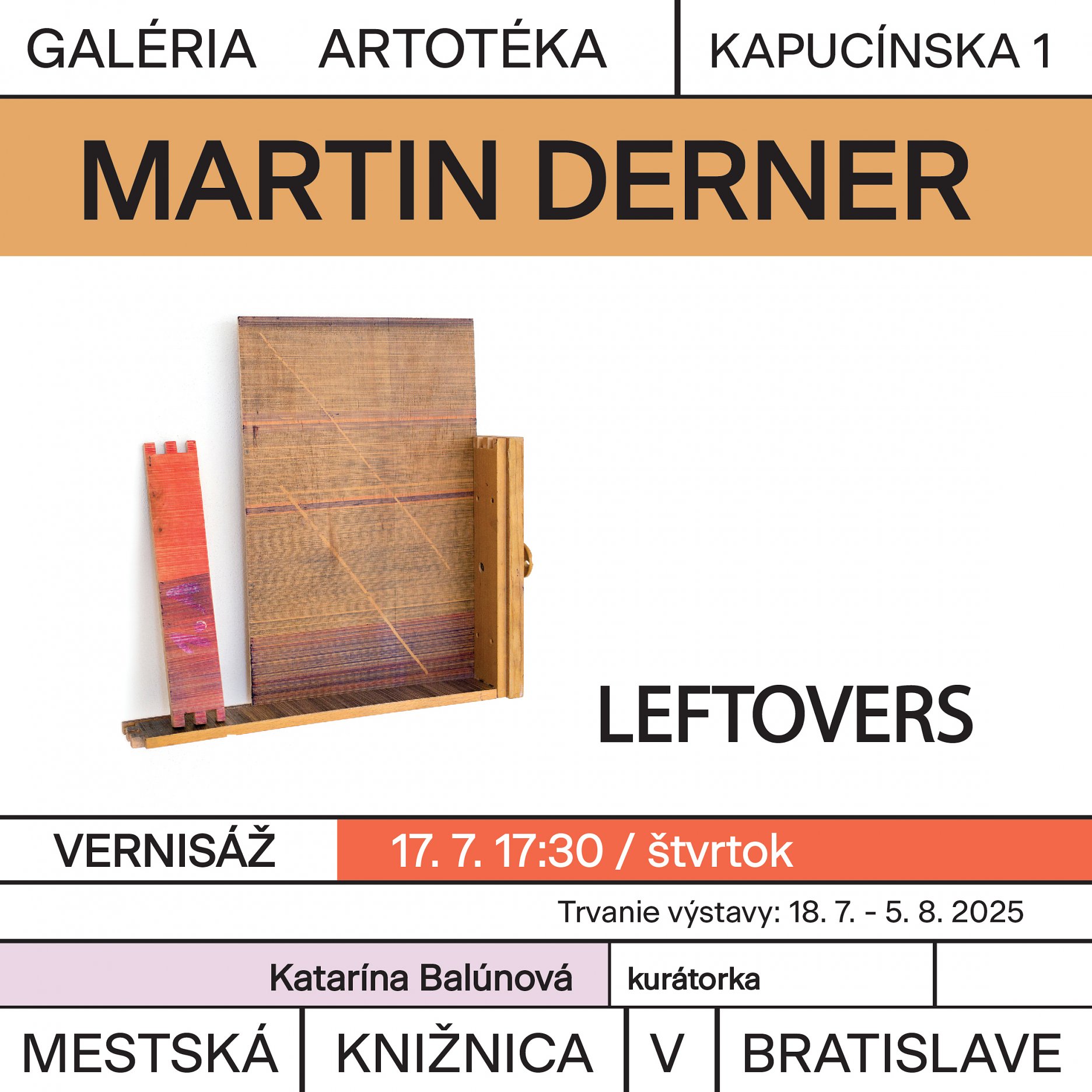Výstava Martina Dernera s názvom Leftovers predstavuje inovatívny a experimentálny prístup k tradičnému médiu kresby, ktorý presahuje jej bežné hranice a rozširuje ju do priestoru a objektu. Výstava predstavuje súbor diel zo širšej série Bytové situácie, ktorá sa zameriava na každodenné prostredie a predmety, ktoré nás obklopujú, pričom skúma ich estetickú a konceptuálnu hodnotu v kontexte plynutia času a opotrebovania. Bytové situácie pracujú s nájdenými fragmentmi nábytku a iných domácich objektov, ktoré umelec transformuje minimalistickými zásahmi s akcentom inteligentného humoru, čím vytvára nové významy a vrstvy interpretácie. Precízne autorské spracovanie materiálu sa stáva rituálom, ktorý vyžaduje koncentráciu a reflexiu. Opakovanie autorského gesta má nielen estetický, ale aj meditatívny a transformačný rozmer, stáva sa nástrojom na hlbšie vnímanie času a procesu, pričom zdôrazňuje plynutie, zmenu a zároveň trvácnosť materiálu. Autor tak komentuje kontinuálny proces zmien, históriu, čas a ľudskú prítomnosť, ktorá ostáva v predmetoch zapečatená. Výstava teda pracuje nielen s narušovaním vnímania každodennosti, ale zároveň kladie otázky o hodnote materiálnych predmetov a o tom, čo v našom živote zostáva, keď pominú pôvodné funkcie či významy.