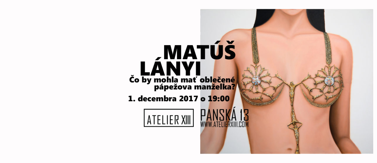 Výstava Matúša Lányiho s názvom „Čo by mohla mať oblečené pápežova manželka?“ prináša netypický, no uvoľnený pohľad na možnú podobu kresťanskej ikonografie v súčasnosti. Názov výstavy napovedá, že autor sa pohráva s citlivou témou pevnej štruktúry pravidiel cirkvi a konfrontuje ju s túžbou človeka odpútať sa od zväzujúcich kultúrnych konvencií.