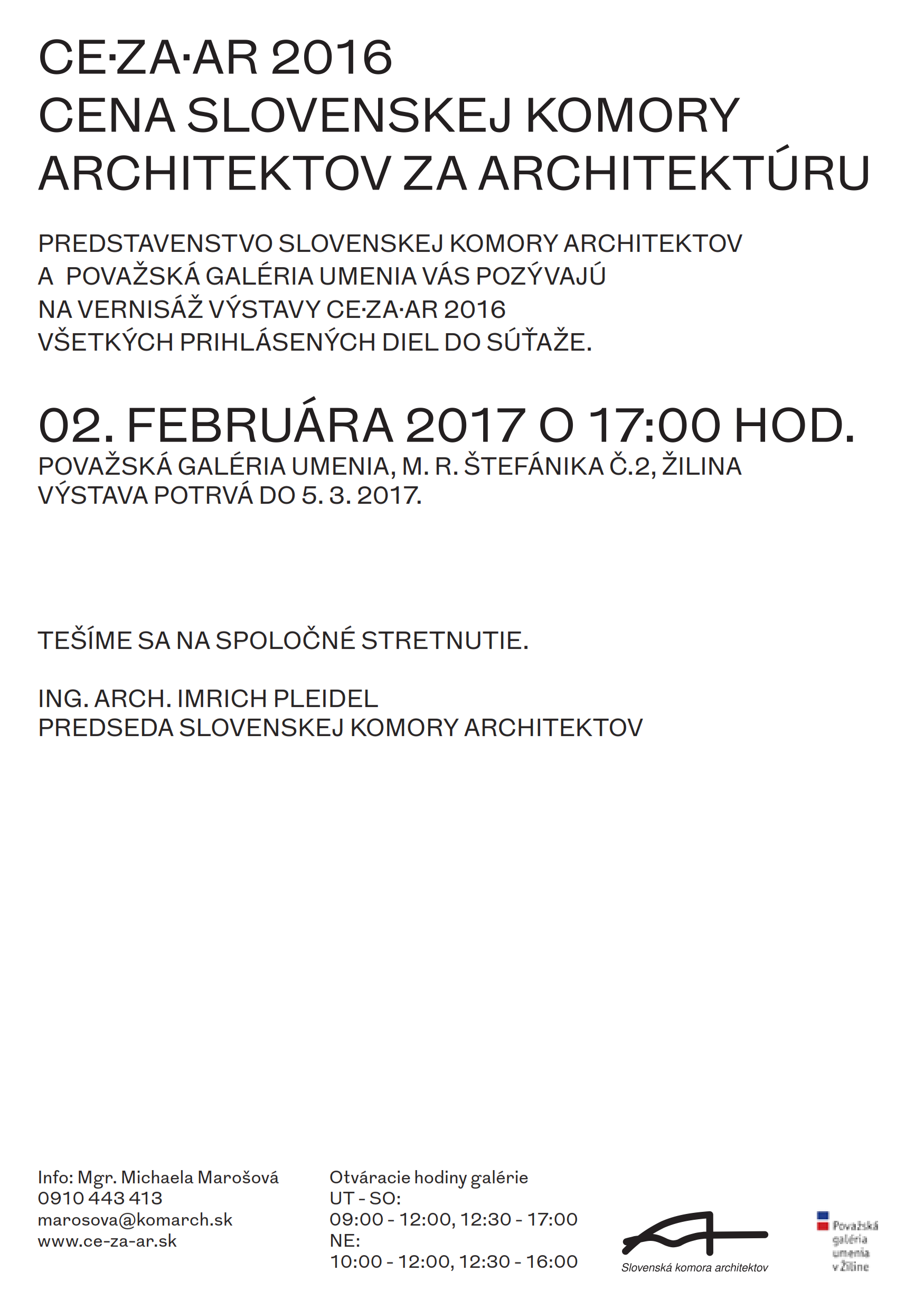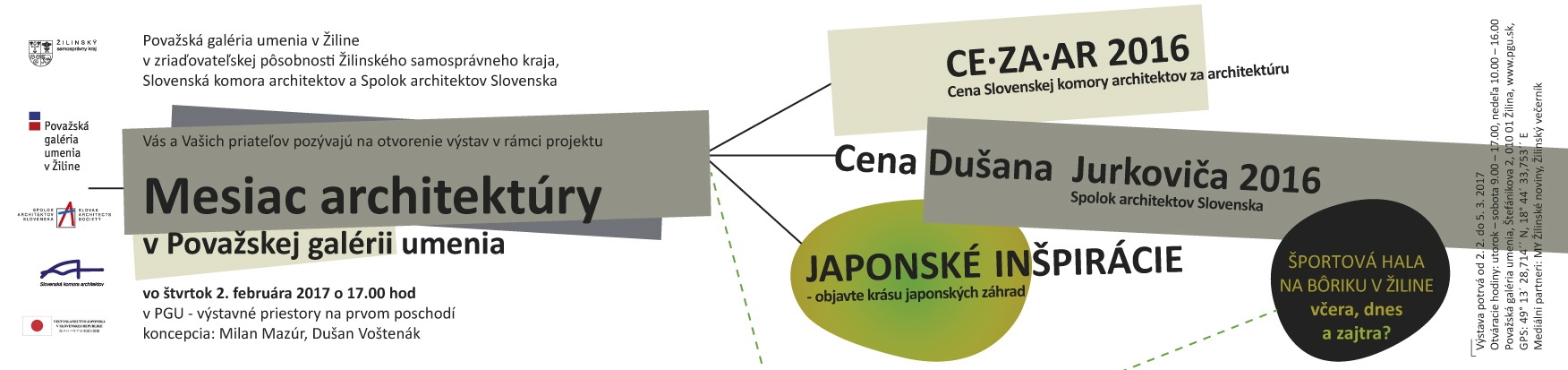 Tretí ročník Mesiaca architektúry v Považskej galérii umenia pozostáva z viacerých výstav prezentujúcich a sumarizujúcich dianie v oblasti architektúry za rok 2016, predovšetkým prostredníctvom súťažných podujatí celoslovenského významu. Jednak je to výstava všetkých diel prihlásených do súťaže CE∙ZA∙AR 2016 - Ceny za architektúru Slovenskej komory architektov. Ďalej je to výstava organizovaná v spolupráci so Spolkom architektov Slovenska, prezentujúca víťazný projekt ocenený Cenou Dušana Jurkoviča v roku 2016. Súčasťou podujatia Mesiac architektúry v PGU Žilina je v tomto roku aj sekcia venovaná histórii i aktuálnemu stavu budovy a projektu Športovej haly na Bôriku v Žiline a prezentácia projektu Japonské inšpirácie - objavte krásu japonských záhrad v kurátorskej koncepcii Tamary Reháčkovej, ktorá sa koná pod záštitou J.E. veľvyslanca Japonska v Slovenskej republike.