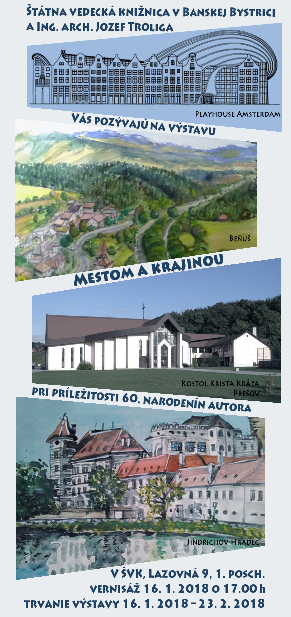 Štátna vedecká knižnica a Ing. arch. Jozef Troliga Vás pozývajú na výstavu Mestom a krajinou pri príležitosti životného jubilea autora. Vernisáž bude 16. 1. 2018 o 17. 00 hod. Výstava potrvá do 23. 2. 2018. Srdečne pozývame.