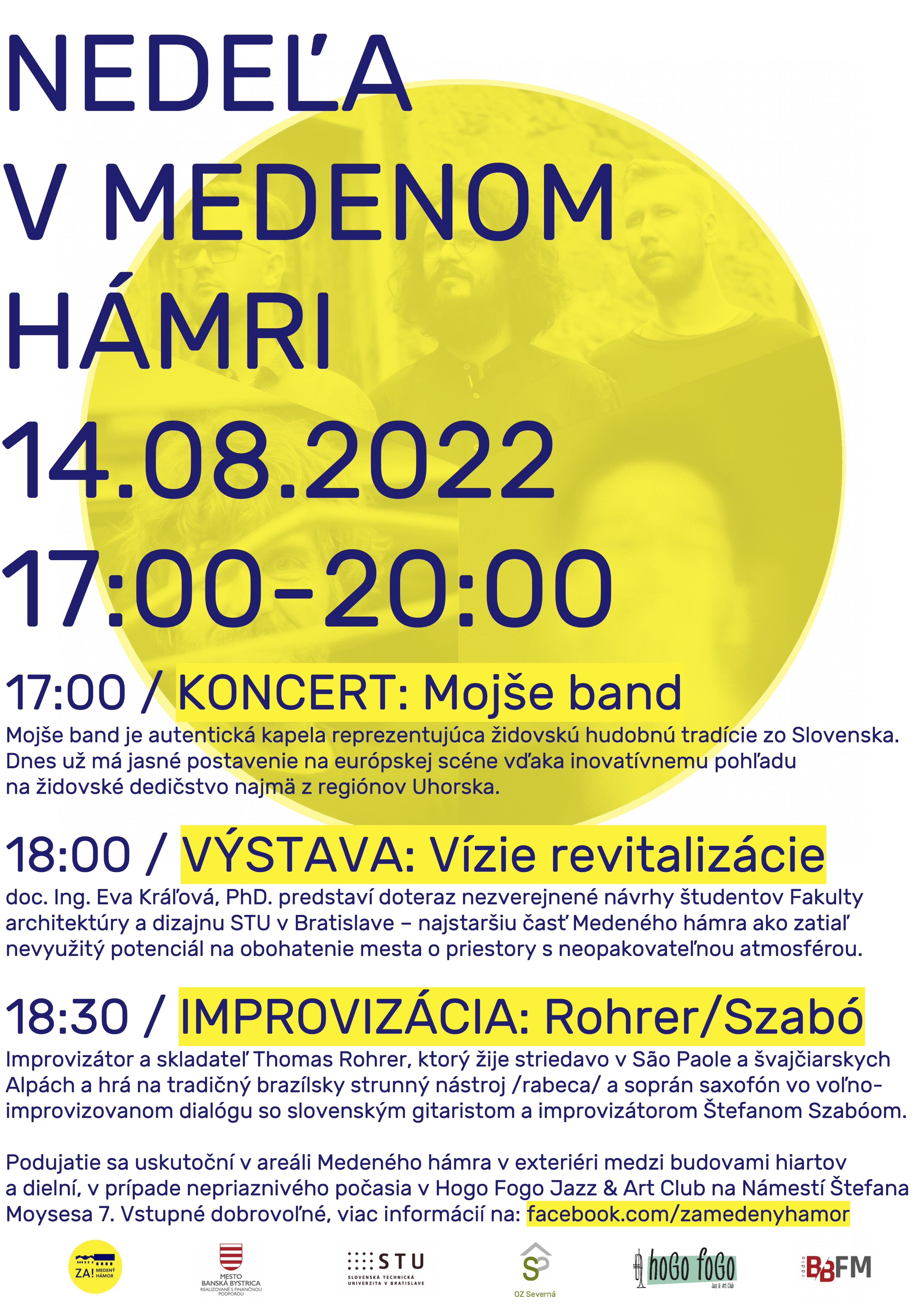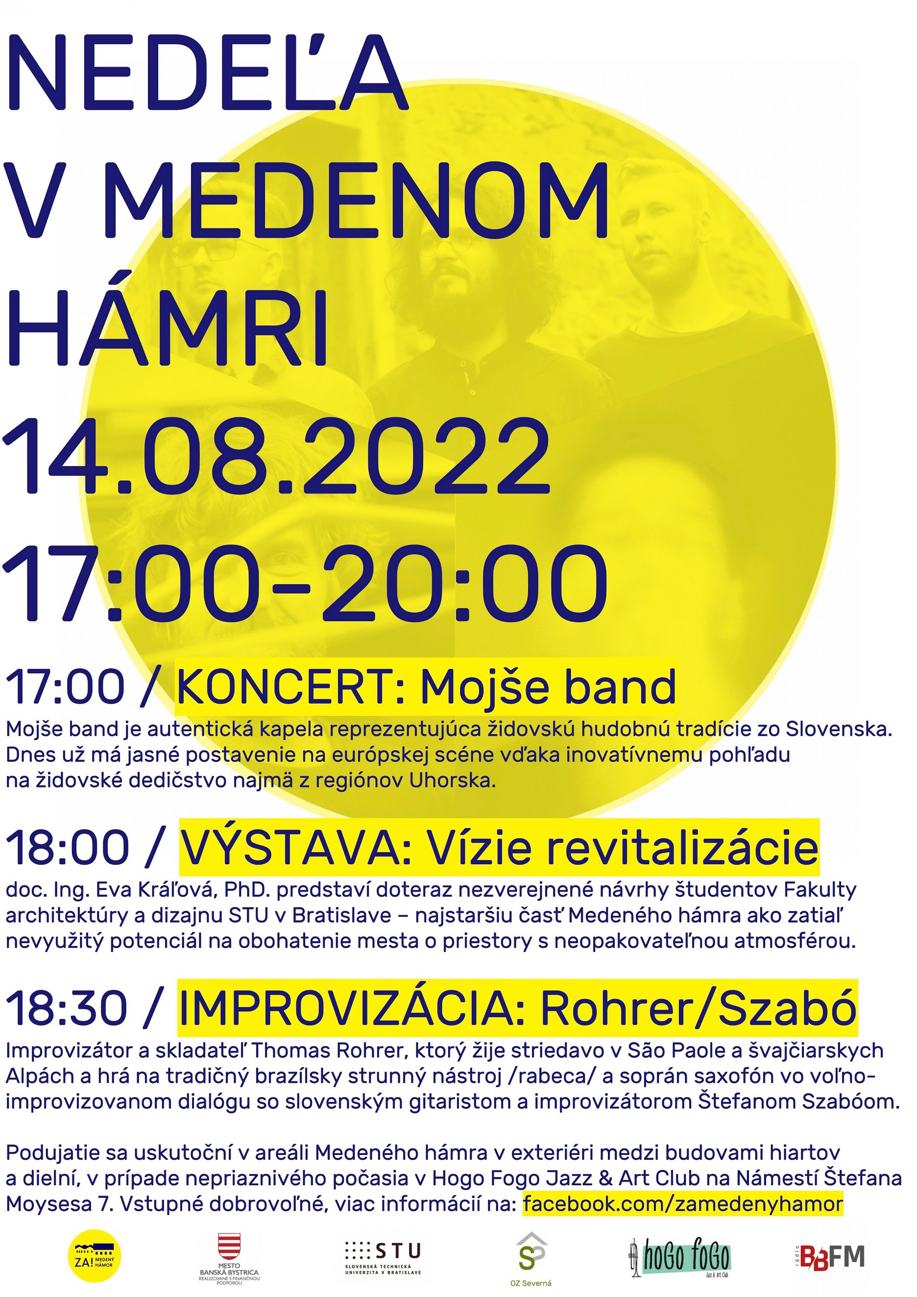 Občianske združenie ZA! Medený hámor v spolupráci s Mestom Banská Bystrica, Slovenskou technickou univerzitou v Bratislave a občianskym združením Severná Vás pozývajú zažiť atmosféru Medeného hámra. V nedeľu 14.08.2022 sa od 17:00 do 20:00 v centre areálu uskutoční ďalšie zo série podujatí Nedeľa v Medenom hámri.