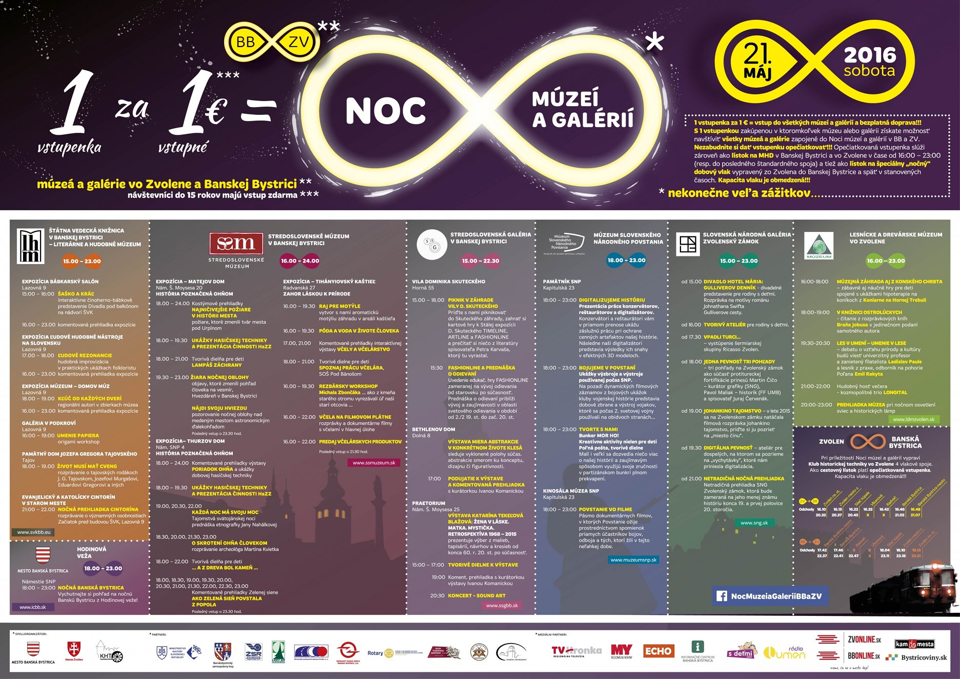 Dvere múzeí a galérií zostanú v sobotu otvorené pre návštevníkov do neskorých večerných a nočných hodín, aby im umožnili prehliadku expozícií. Popri tom ponúknu všetkým bohatý sprievodný program. Aktivity múzeí a galérií sú orientované najmä na rozšírenie tradičnej ponuky múzeí a na činnosti, ktoré po celý rok zostávajú pred verejnosťou ukryté. Prehliadka depozitárov, ukážky reštaurovania, odborné poradenstvo v rôznych oblastiach od umeleckých až po prírodovedné, či nočné prehliadky expozícií s pútavým výkladom kurátorov sú aktivity, ktoré pomôžu verejnosti aj prostredníctvom takto získaných poznatkov a informácií lepšie chápať význam múzeí a galérií a ich úlohy pri záchrane, ochrane a sprístupňovaní kultúrneho dedičstva.