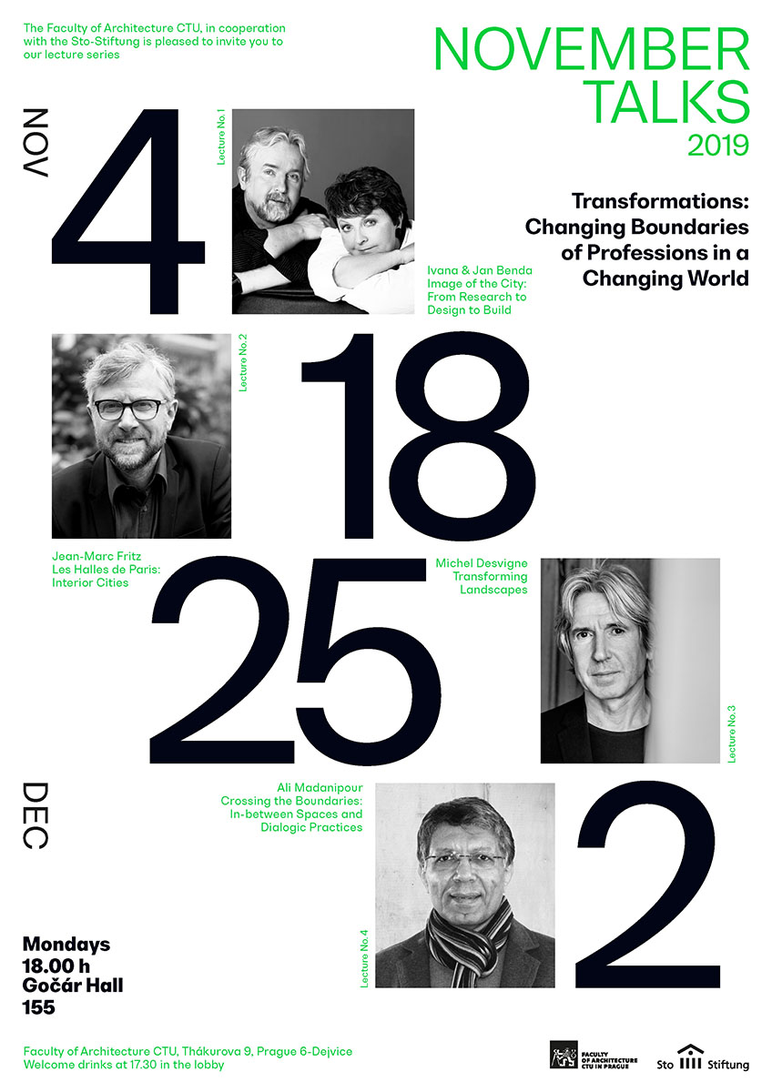 Novembrové príhovory zahraničných architektov, urbanistov a krajinárskych architektov sa tento rok budú venovať premenám hraníc profesií a úloh, ktoré im sú kladené v dnešnom meniacom sa svete. Séria prednášok s názvom November Talks, ktoré od roku 2006 podporuje nadácia Sto Foundation na európskych školách architektúry, sa tento rok koná nielen na fakulte ČVUT, ale aj v Londýne, Paríži, Benátkach, Stuttgarte a Grazi.