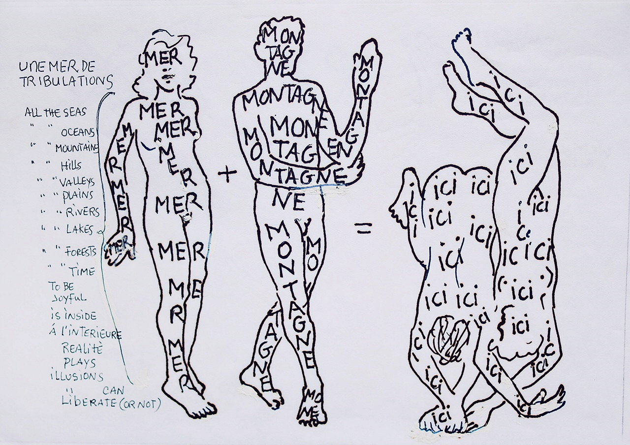 Revealing a quasi-diaristic approach to inspiration-seeking, Adorno's works attempt to explore movement-generated images as inquiries, rebuses, collages, and conceptual maps contained within the borders of paper sheets. Here, language becomes the protagonist of the composition, alternating visual and structural elements, such as an eye substituting the artist's "I", or sound associations based on the scrambling of English and French words. The skewed position of characters, the typographic difference among signs, and the combination of symbols and letters invite the viewer to complete the drawings by voicing sounds, resolving linguistic puns, and responding to questions. The phonetic dimension of Adorno's works gives a concrete dimension to subjectivity and the body. Indeed, Adorno's work cannot be understood without taking into consideration her performance practice. As a pivotal-yet under-acknowledge-figure in the development of Performance Art, Adorno was integral to the groundbreaking real-time activities of the 1960s and 1970s in downtown New York. With a brilliance for radical, on-the-sport inventions, Adorno took part in happenings and performances including Robert Whitman's Small Cannon (1959), Claes Oldenburg's Photo Death (1960), Trisha Brown's Rule Game Five (1964) at Judson Church, Karlheinz Stockhausen's Original (1964) in Charlotte Moorman's Second Avant Garde Festival, and Deborah Hay's Solo (1966) in 9 Evenings: Theater and Engineering, among others.