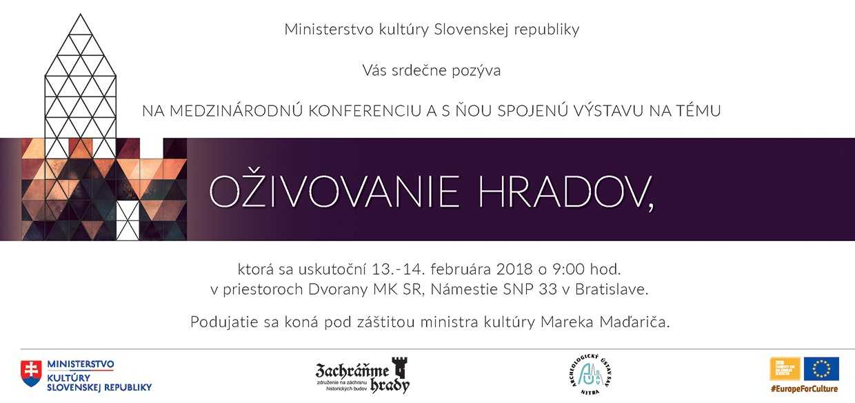 Medzinárodnú konferenciu a výstavu na tému OŽIVOVANIE HRADOV organizuje Ministerstvo kultúry Slovenskej republiky, spoločne s partnermi: Združenie Zachráňme hrady a Archeologický ústav SAV Nitra. Konferencia sa uskutoční v Dvorane MK SR, Námestie SNP 33, Bratislavav, v dňoch 13.-14. február 2018, výstava je otvorená od 15.2. do 28.2. 2018.