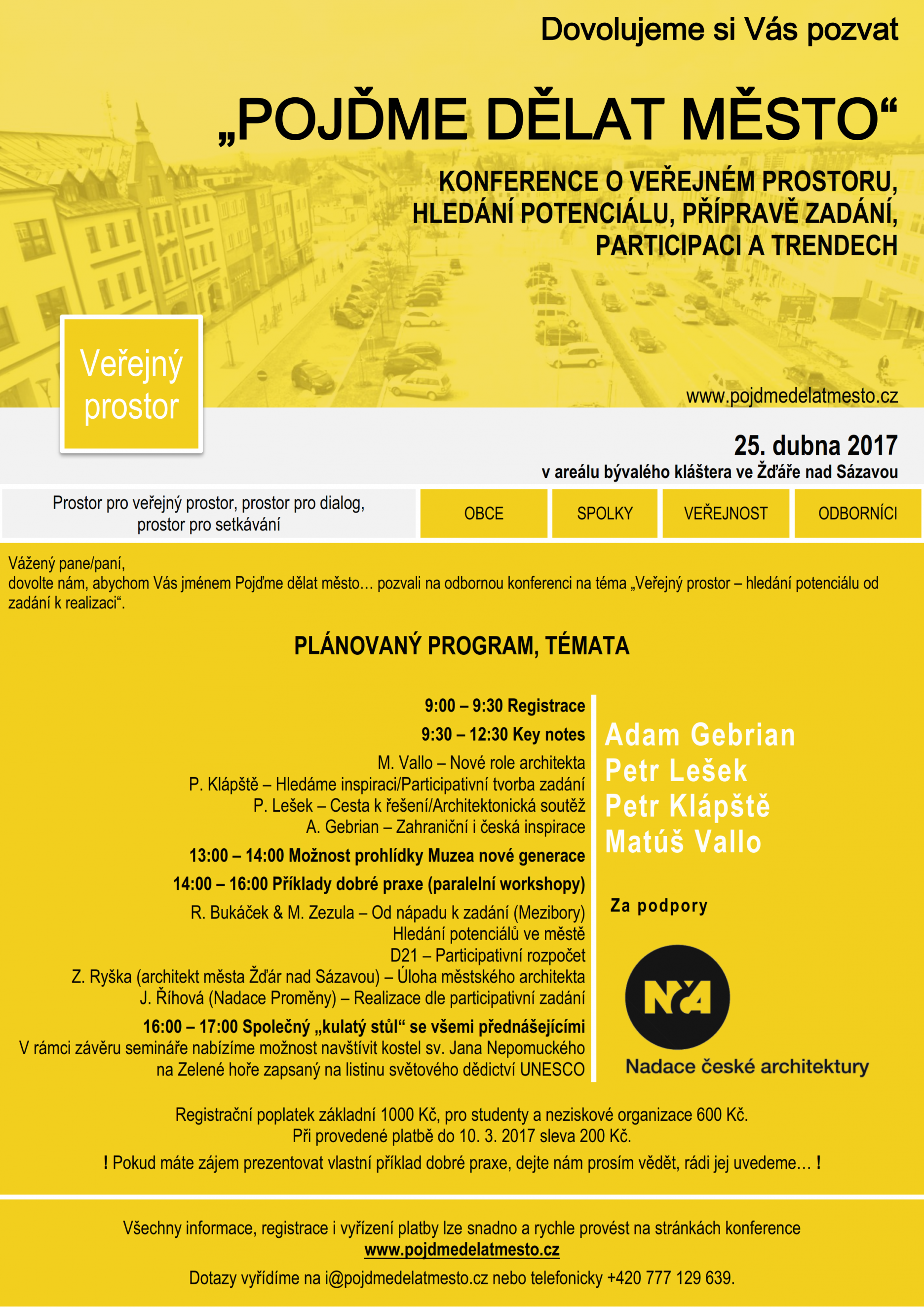 Na konferencích bývají často prezentovány ukázky přístupů velkých světových metropolí nebo teoretické koncepty. Výzva Pojďme dělat město se zaměřuje na města spíše menší a jejím těžištěm jsou konkrétní příklady dobré praxe. V prvním ročníku máme tu čest uvítat 25. dubna 2017 v krásných prostorách Zámku Žďár nad Sázavou A. Gebriana, M. Valla, P. Klápštěho, P. Leška a další.