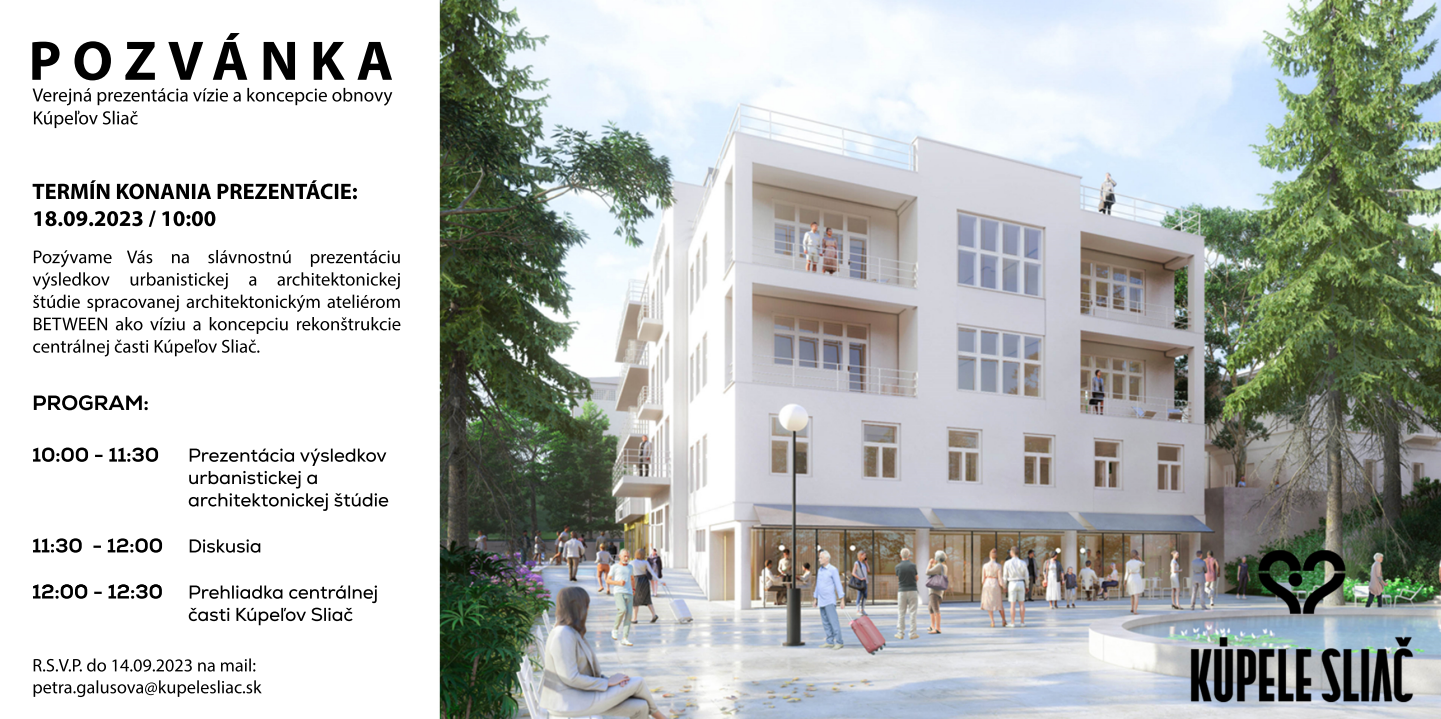 dovoľte nám aby sme Vás pozvali na prezentáciu našej práce na projekte " Obnova Kúpeľov v Sliač ". Náš ateliér rozpracoval súťažný návrh do podoby urbanisticko & architektonickej štúdie ktorú by sme Vám ako zástupcom odbornej verejnosti radi predstavili. Prosím prijmite naše pozvanie na plánovanú verejnú prezentáciu dňa 18.9.2023 o 10:00 v priestoroch kúpeľov Sliač.