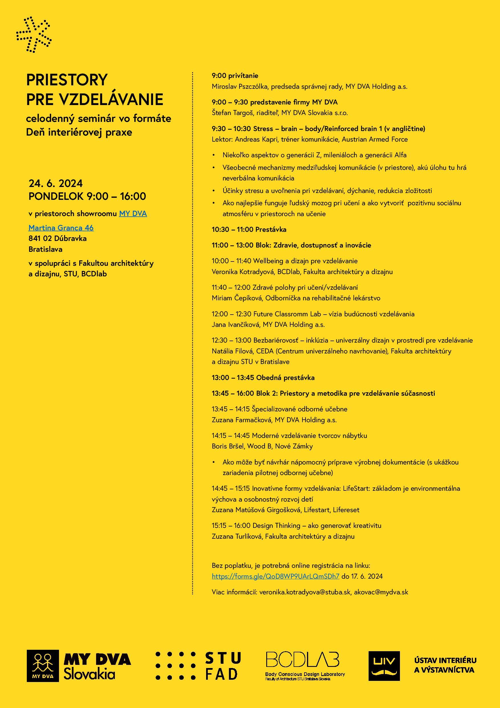 Spločnosť MY DVA v spolupráci s Fakultou architektúry a dizajnu, STU, BCDlab Vás srdečne pozýva na zaujímavé celoddené podujatie, kde sa dozviete o nových trendoch, požiadavkach a možnostiach pri navrhovaní a realizácii moderných priestorov pre vzdelávanie.