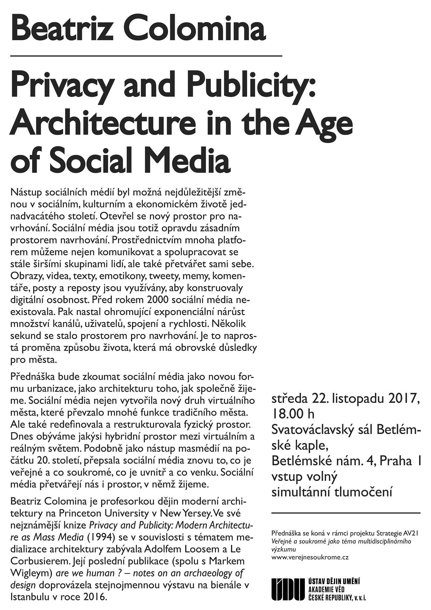 Přednášku pořádá Ústav dějin umění AV ČR v rámci projektu Strategie AV 21 Veřejné a soukromé jako téma multidisciplinárního výzkumu, je součástí doprovodného programu výstavy „Veřejný prostor CZ“ (31. 10.–24. 11. 2017) v Galerii Jaroslava Fragnera.