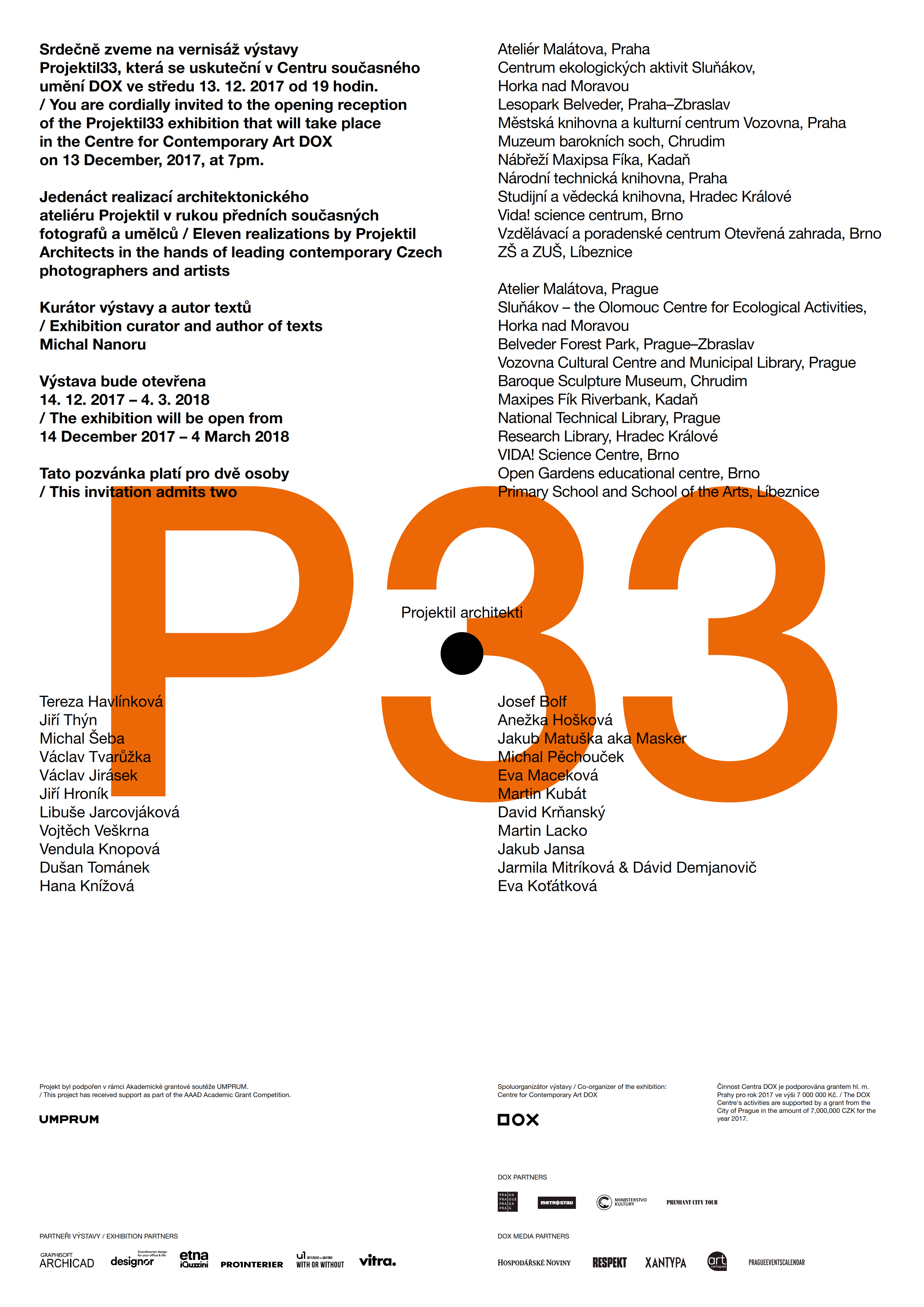 Ateliér Projektil architekti vešel ve známost cenami za Národní technickou knihovnu v pražských Dejvicích, Studijní a vědeckou knihovnu v Hradci Králové či ekocentrum Sluňákov a rovněž svým trvalým zájmem o veřejný prostor. Pro jeho způsob práce je charakteristická otevřená spolupráce napříč mnoha obory. Pro svůj nejnovější výstavní projekt tak architekti oslovili kurátora Michala Nanoru. Výsledkem je výstava, na které představí své vnímání architektury jedenáct předních českých fotografů a výtvarníků. V pražském Centru současného umění DOX bude otevřena do 4. 3. 2018.