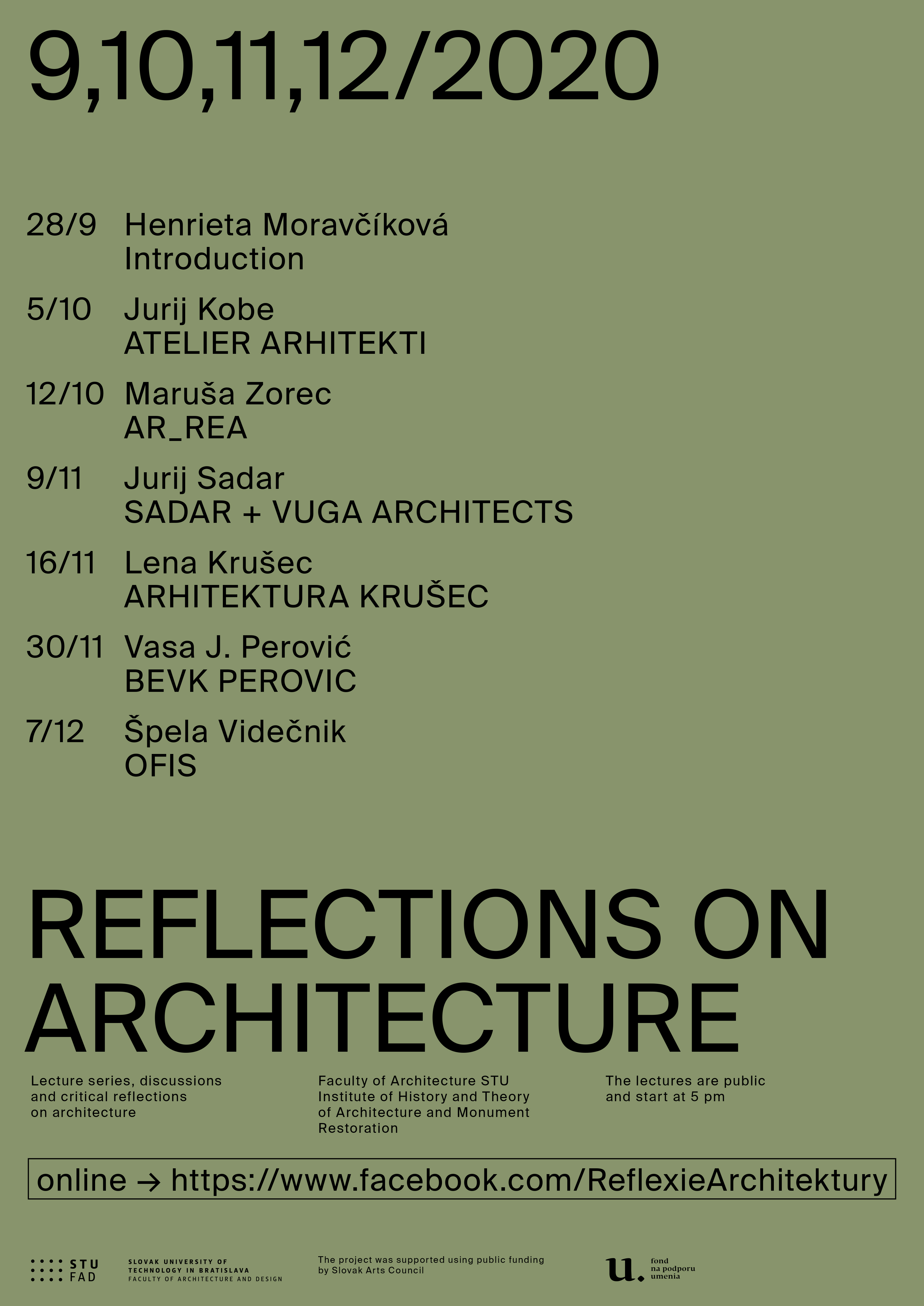 Cyklus prednášok bude tento rok pozostávať zo špičky súčasnej slovinskej architektonickej scény. Reflexie architektúry sa snažia už piaty rok podnietiť diskusiu ohľadom aktuálneho architektonického diania a živé reflektovanie verejnosti bolo vždy súčasťou podujatí. Tento rok sa s ohľadom na bezpečnosť stretneme v online priestore, veríme však v rovnako zaujímavé stretnutia s významnými hosťami. Prednášky budú naživo vysielané na facebooku Reflexií.