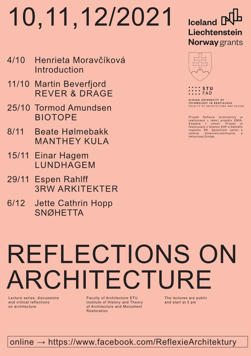 Cyklus prednášok tento rok pozostáva z pozoruhodných mien súčasnej nórskej architektonickej scény. Reflexie architektúry sa snažia už piaty rok podnietiť diskusiu ohľadom aktuálneho architektonického diania. Tento rok je cyklus prednášok súčasťou projektu Empatia v umení, čomu zodpovedá aj výber hostí. Architekti a architektky rôzneho zamerania priblížia svoju tvorbu, ktorá je empatická voči jednotlivcovi, spoločnosti, či životnému prostrediu. Hostia nám ukážu odlišné roly architekta v dnešnom svete.