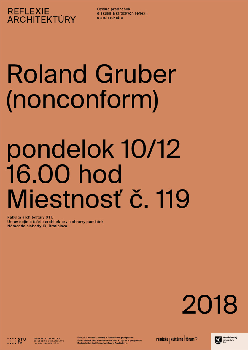 Roland Gruber (*1972) študoval na umeleckej univerzite v Linzi so zahraničným pobytom na ETH v Zürichu. V roku 1999 spoluzakladal ateliér Nonconform (https://www.nonconform.at/#start) . Pravidelne prispieva do časopisov Architektur Aktuell a Architektur & Bau Forum. Nonconform prepája architektúru so sociológiou a mestským rozvojom, funguje ako mestský poradca pri participatívnych projektoch. / Prednáška v anglickom jazyku prebehne vďaka podpore Bratislavského samosprávneho kraja a Rakúskeho kultúrneho fóra.