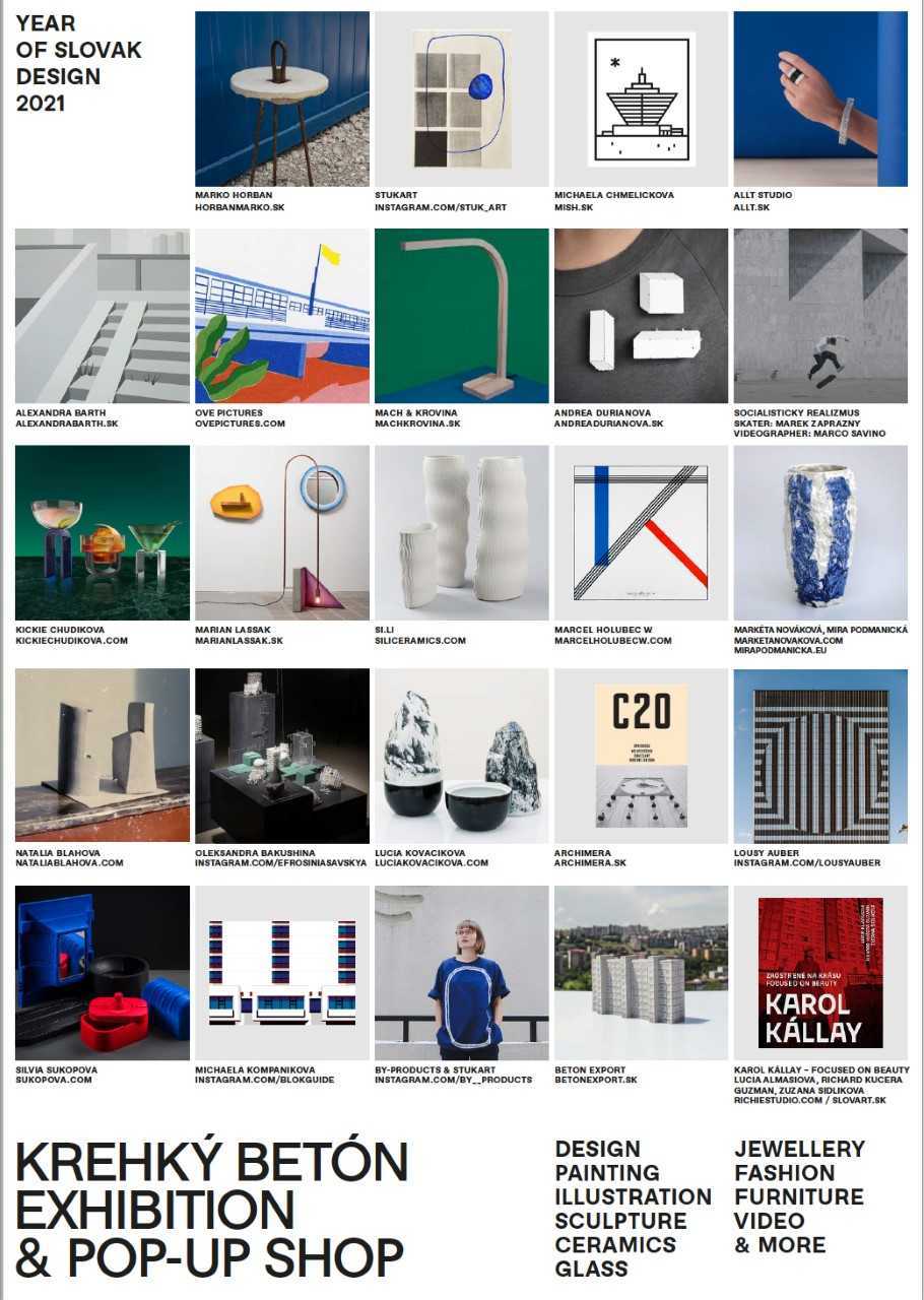 Krehký betón - výstava predstaví viac ako 20 slovenských dizajnérov, umelcov a štúdií. Rôzne diela spája spoločný vizuálny jazyk, ktorý odráža najkrehkejšie esenciu modernistickej estetiky. V úvode sa predstaví pop-up shop - predajná výstava vybraných slovenských dizajnérov, ktorá bude začiatkom septembra rozšírená o nepredajné diela ďalších slovenských dizajnérov. Niekoľkomesačný francúzsko-slovenský projekt tak zavŕši reprezentatívna prehliadka slovenského dizajnu, ktorý je inšpirovaný mestským prostredím a estetikou brutalistickej architektúry.