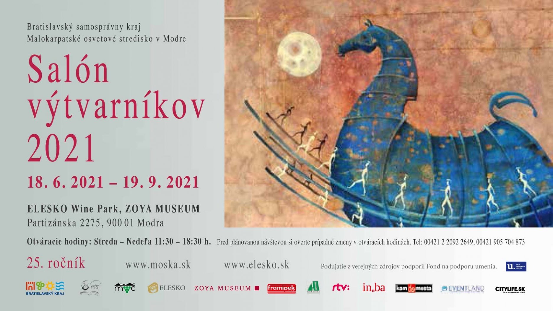 Výstava Salón výtvarníkov v Zoya Museum - ELESKO Wine Park v Modre je pre verejnosť prístupná od 18. júna do 19. septembra 2021, počas návštevných hodín od stredy do nedele, v čase od 11.30 do 18.30. Viac informácií o možnosti jej návštevy nájdete na stránke www.elesko.sk