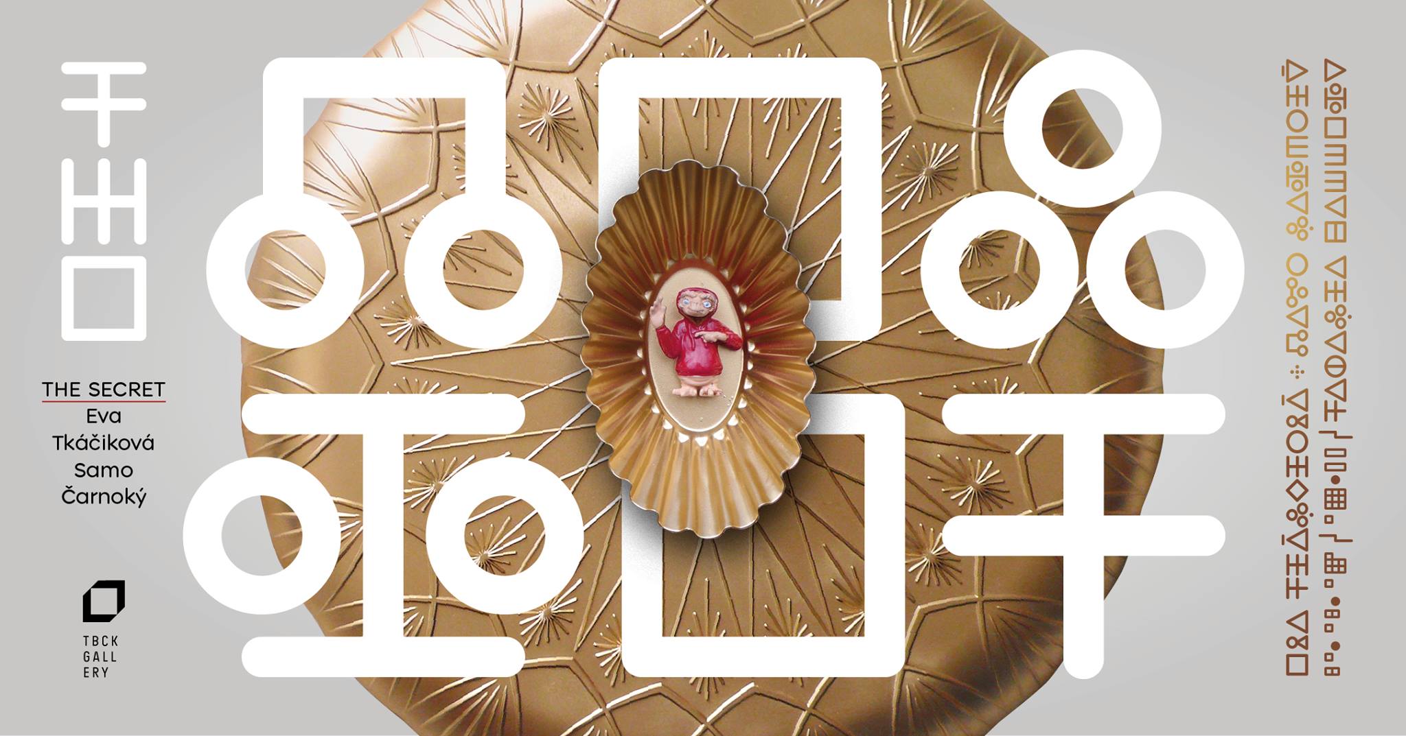 V rámci tohto projektu Čarnoký vytvoril digitalizované písmo inšpirované tajným písmom Evy Tkáčikovej, ktoré používala vo svojej tvorbe ku koncu 20. storočia. Tkáčiková narába so svojimi iniciálami, mixuje kresťanské prvky so sci-fi kultúrou, vytvára novodobé vesmírne kaplnky a triumfálne scény v pozlátených lúčoch obklopujúcich ikonu mimozemskej civilizácie ‒ E. T. mimozemšťana. Autori, vychovaní v duchu kresťanskej tradície, odkazujú nielen na sakrálnu symboliku (ryba ‒ Ichthys, holubica ‒ Duch Svätý...), ale aj na na spirituálnu filozofiu Eckharta Tolleho (E. T.), ktorý rozumie duchovným potrebám dnešného človeka. Inštaláciu zjednocujú vznešenou zlatou farbou a kresťanskú minulosť miešajú s tolerantnou filozofiou a náboženstvom 21. storočia. Texty sádzané tajným písmom Secret Space sú fragmentami z kultovej knihy E. Tolleho Sila prítomného okamihu. Zvuk je realizovaný v spolupráci s hudobníkom a muzikológom Michalom Hottmarom.