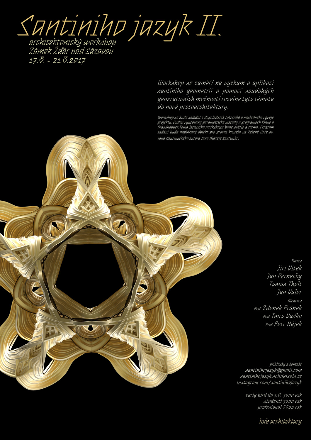 Participanti workshopu budou uvedeni do agendy generativní architektury. Skrze tutoriály zaměřené na základní i pokročilé techniky budou interpretovat Dynamickou barokně gotickou architekturu J.B.Santiniho do nových architektonických struktur a protoobjektů. Pod tématem letošního kurzu bude prostor a světlo. Studenti budou vedeni zkušenými tutory a budou konzultovat z matadory české architektury.