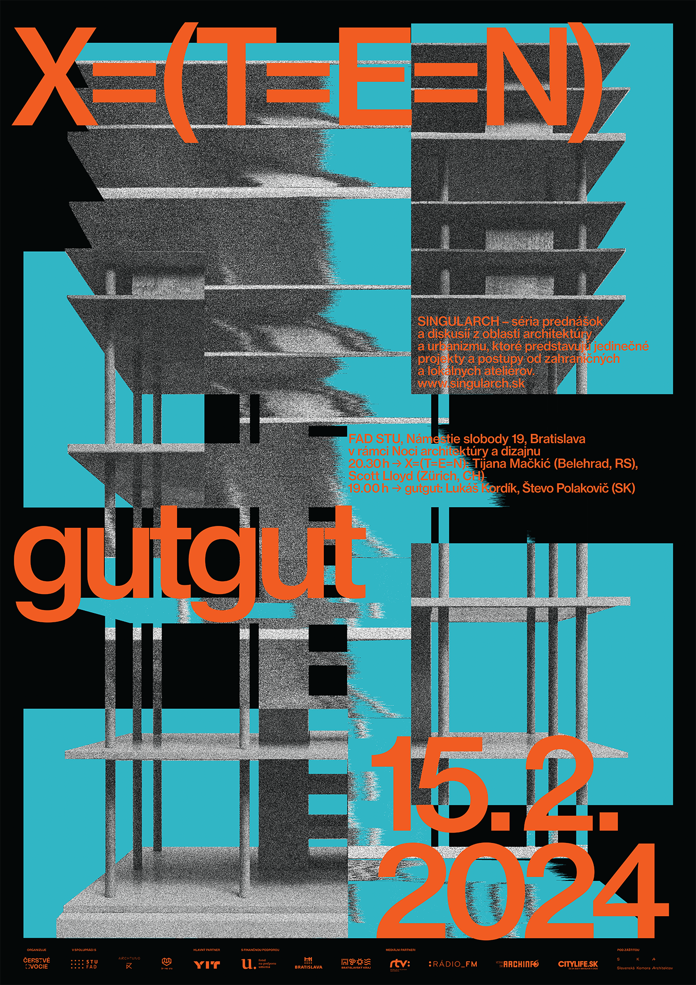 Prednášky tvoria súčasť programu Noci architektúry a dizajnu, ktorá sa uskutoční na pôde Fakulty architektúry a dizajnu STU v Bratislave 15. 2. 2024. SINGULARCH aktuálne predstaví tvorbu dynamického kolektívu X = ( T = E = N ) so základňami v Belehrade a Zürichu. Pred prednáškou hlavných hostí, vo formáte REFERENCIE, porozprávajú vedúci ateliéru GutGut Lukáš Kordík a Števo Polakovič o východiskách a inšpiráciách, ktoré ovplyvňujú ich proces tvorby.