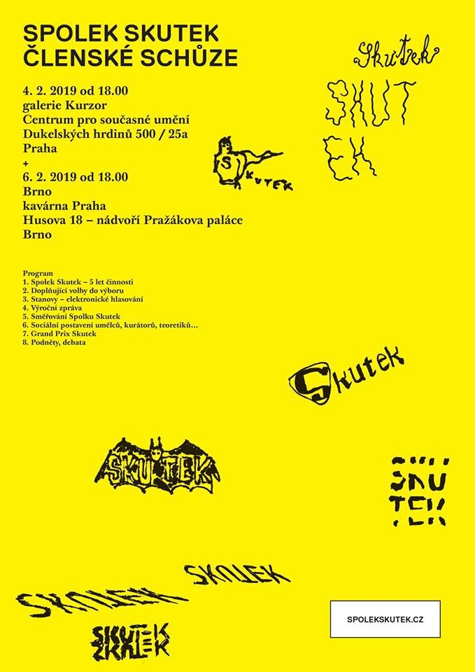 Schůze se uskuteční v pondělí 4. února 2019 od 18:00 v Galerie Kurzor v Praze (Dukelských hrdinů 500/25a, Praha 7) a ve středu 6. února 2019 od 18:00 v Brně v kavárně PRAHA / Fórum pro architekturu a média (Husova 535/18, Brno). Vyberte si, jaké z míst je vám bližší (místně, časově i jinak) a přijďte se informovat o skutkových novinkách, zapojit do diskuse, voleb do výboru, hlasování a o Grand Prix Skutku (rozhodnout může i váš hlas) – zkrátka skutkového života.