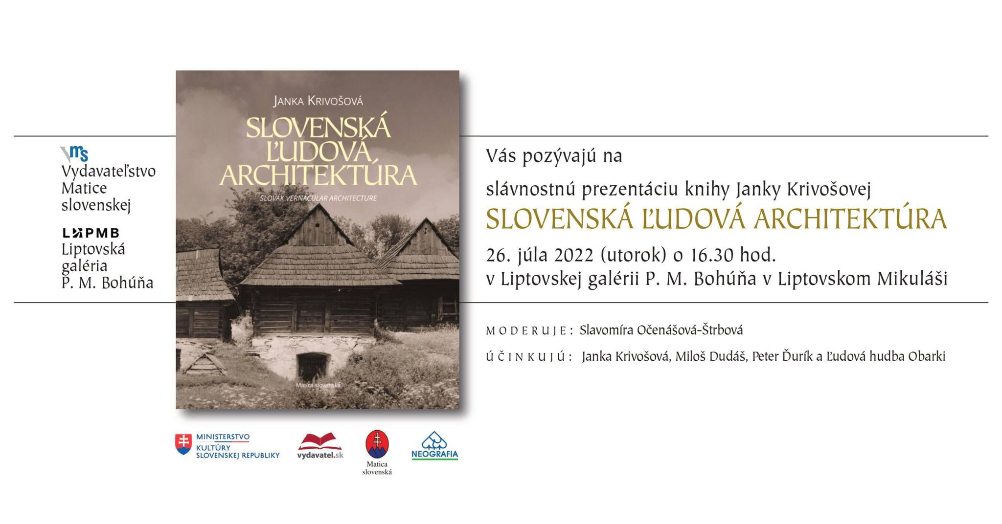 Vydavateľstvo Matice slovenskej a Liptovská galéria P. M. Bohúňa Vás pozývajú na slávnostnú prezentáciu knihy Janky Krivošovej - SLOVENSKÁ ĽUDOVÁ ARCHITEKTÚRA, v utorok 26. júla 2022 o 16:30 hod. do Liptovskej galérie P. M. Bohúňa v Liptovskom Mikuláši.