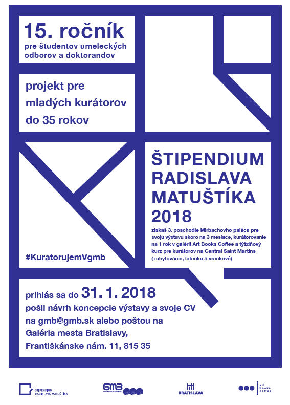 Ak si študent/-ka, absolvent/-ka alebo doktorand/-ka do 35 rokov v umeleckom odbore a máš skvelý nápad na výstavný projekt, pošli nám svoj návrh do 31. januára 2018 na adresu gmb@gmb.sk alebo poštou na adresu Galéria mesta Bratislavy, Františkánske nám 11, 815 35 Bratislava. Získať môžeš okrem priestoru pre svoj projekt v Mirbachovom paláci aj týždňový kurz na prestížnej škole Central St. Martins a ročné kurátorovanie v ART BOOKS COFFEE !