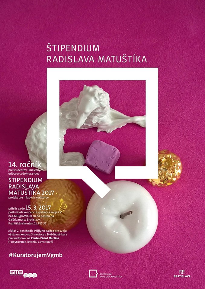 Ak si študent/-ka, absolvent/-ka alebo doktorand/-ka v umeleckom odbore a máš skvelý nápad na výstavný projekt, pošli nám svoj návrh v rámci projektu Štipendium Radislava Matuštíka do 15. marca 2017 na adresu gmb@gmb.sk alebo poštou na adresu Galéria mesta Bratislavy, Františkánske nám 11, 815 35 Bratislava. Získať môžeš okrem priestoru pre tvoj projekt v Pálffyho paláci aj týždňový kurz na prestížnej škole Central St. Martins.