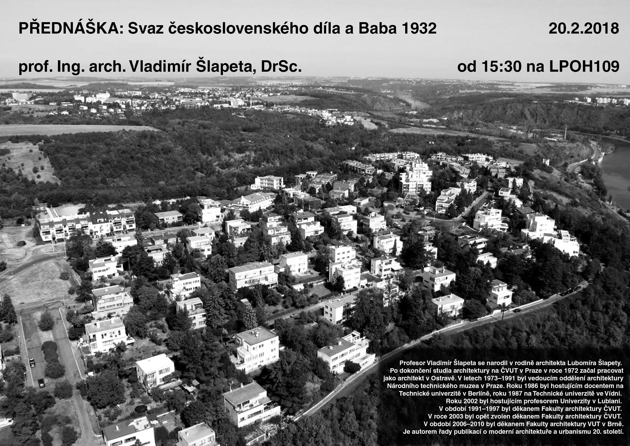 přednáška prof. Ing. arch. Vladimíra Šlapety, DrSc. na téma "Svaz československého díla a Baba 1932", která proběhne v úterý 20. února na Fakultě stavební v Ostravě od 15:30 v místnosti LPOH109.