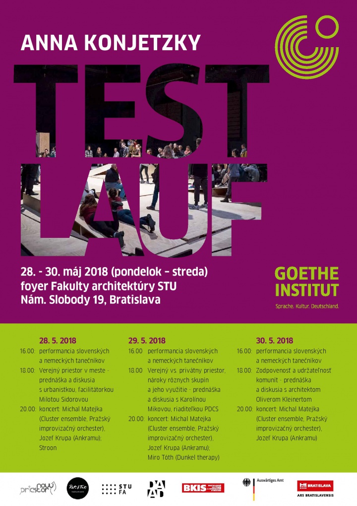 TESTLAUF („testovací priestor“), je projekt nemeckej choreografky Anny Konjetzkej. Vo vstupnej hale STU v Bratislave pripraví veľký otvorený priestor – (drevené) javisko,do ktorého prizve tanečníkov, hudobníkov, odborníkov na tému urbanizmu a architektúry, ale predovšetkým nás divákov. Pozýva do priestoru, ktorý sa bude meniť a vytvárať nové situácie pre tanečníkov, nové prekážky a tým aj nové asociácie pre divákov. Každý deň po performancii bude nasledovať diskusia. Čas diskusie (v.dole) je orientačný a bude sa odvíjať od improvizačných situácií, ktoré budú vznikať v rámci performancie.