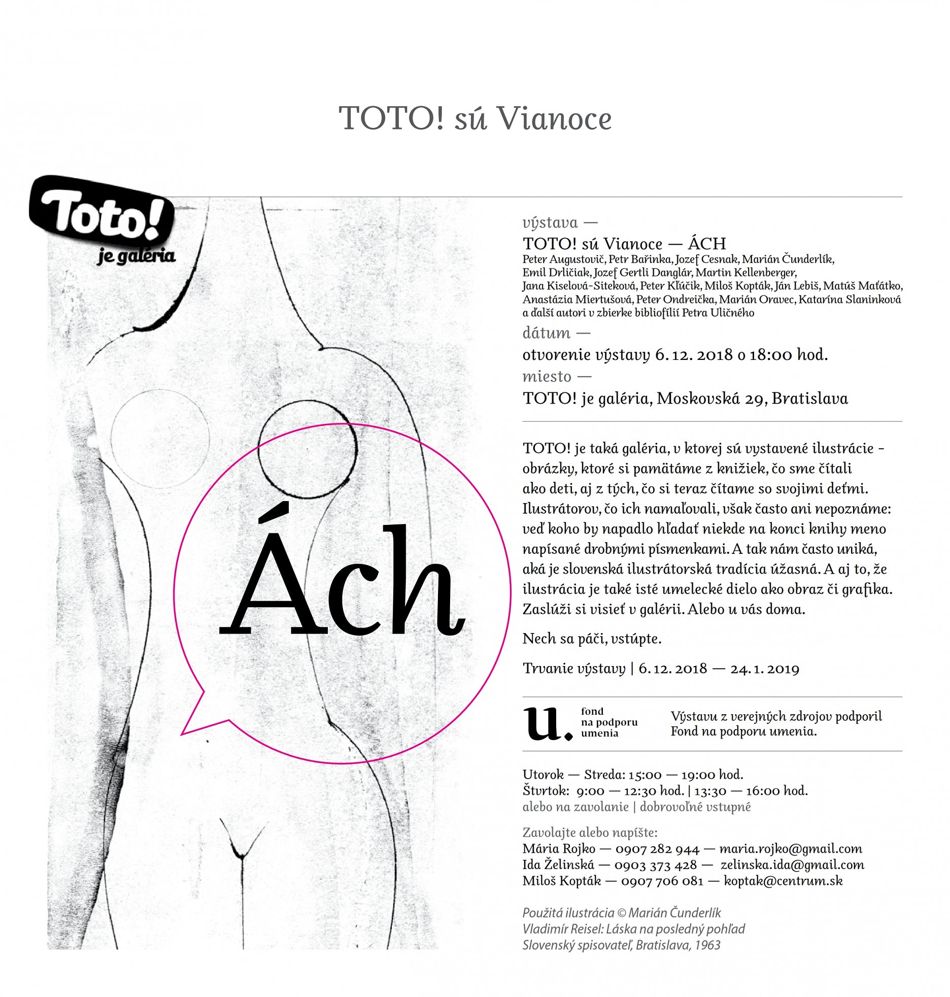 A tak výstava Ách V TOTO! je galéria na Moskovskej 29 v Bratislave graduje tak, ako gradujú vzťahy. Stojíte v miestnosti a vidíte ako napätie medzi ženou a mužom stúpa od nežných, poetických ilustrácií Jany Kiselovej-Sitekovej, cez nečakane robustné lino Jozefa Cesnaka, aj dlhé a tenké ťahy perom (akoby cez celé telo) Martina Kellenbergera. Ako si to šepkávané razí cestu cez tučnučké nahé postavičky Petra Kľúčika, ktoré si tú rozkoš na stránkach doslova dionýzovsky užívajú, či rovnako vtipné zobrazenie Dekameronu od Jána Lebiša, naratívne ilustrácie Mariána Oravca, aj vášnivý scribbling, ten rýchly, až neurotický ťah pera Petra Ondreičku, v opozite k tichej vášni poézie Mily Haugovej. Tak ako sa vzťahy skladajú z kúskov, také sú aj na stenách galérie koláže Mariána Čunderlíka, Anastázie Miertušovej a Petra Augustoviča. A tak, ako dotyk medzi mužom a ženou nie je vždy láskou a nie je vždy vznešený a čistý, ale ľahko sa preklopí do násilia, také sú aj hutné, surové ilustrácie bez zábran od Jozefa Gertliho Danglára k prvej knihe Petra Pišťaneka Rivers of Babylon, aj Kataríny Slaninkovej k jeho (Pišťanekovej) nevydanej knihe Obludárium. Osobitými časťami výstavy sú podhľady na intimitu v autorských knihách Miloša Koptáka, Emila Drličiaka, Matúša Maťátka a Petra Bařinku a rovnako tak erotické bibliofílie slovenských autorov predvojnového obdobia až štyridsiatych rokov zo zbierky Petra Uličného. Výstavu Ách si môžete pozrieť v TOTO! je galéria na Moskovskej ul. 29 v Bratislave od 6. 12. 2018 do 24. 1. 2019. Výstavu z verejných zdrojov podporil Fond na podporu umenia.